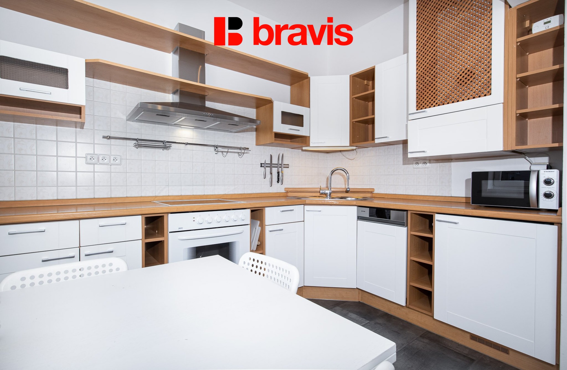 Vybavení bytu: moderní kuchyňská linka se spotřebiči sklokeramická deska, trouba, digestoř, myčka, lednice a mikrovlnná trouba)