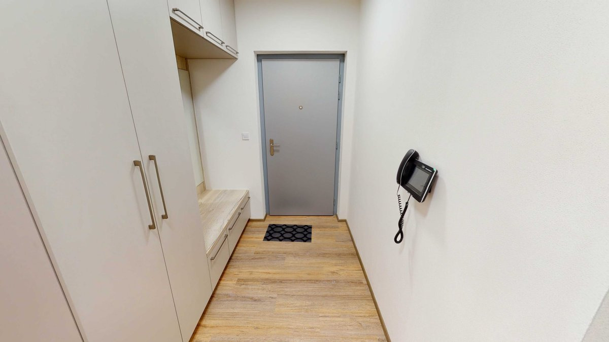 Byt se nabízí částečně vybavený. Kuchyňský kout disponuje se všemi spotřebiči - lednice, mikrovlnka, elektrická trouba, sklo-keramická deska, digestoř a myčka. V obývací části je tv stěna. Ložnice je vybavena šatní skříní. Všechna okna mají venkovní elektronické žaluzie. V koupelně se nachází sprchový kout, umyvadlo se zrcadlem a toaleta. V předsíní je přípojka na pračku a sušičku. Dále je předsíň vybavena na míru dělanou šatní skříni a úložnými prostory.