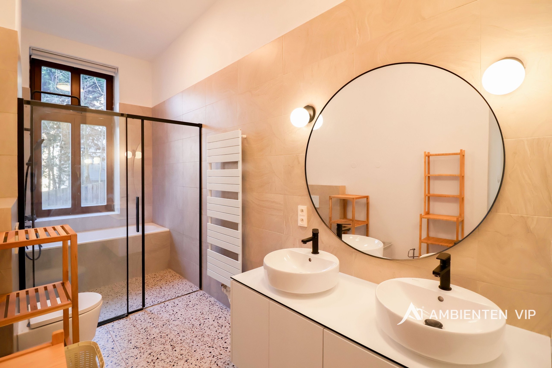 Součástí bytu je také zabezpečovací systém, bezpečnostní vstupní dveře a kamerový systém v domě. Vytápění a ohřev vody je zajištěno plynovým kotlem. Pro regulaci teploty je k dispozici termostat. Byt je dále vybaven kombinovanou pračkou se sušičkou. Veškeré vybavení interiéru zobrazené na fotografiích je zahrnuto v pronájmu.