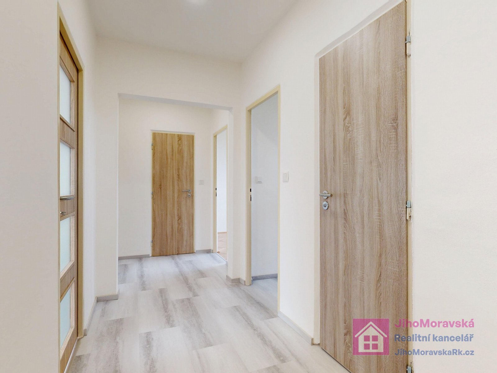předsíň, pokoj, toaleta, koupelna (sprchový kout), pokoj se vstupem na balkón, šatna, pokoj a kuchyň. V přízemí bytového domu zděná sklepní kóje.