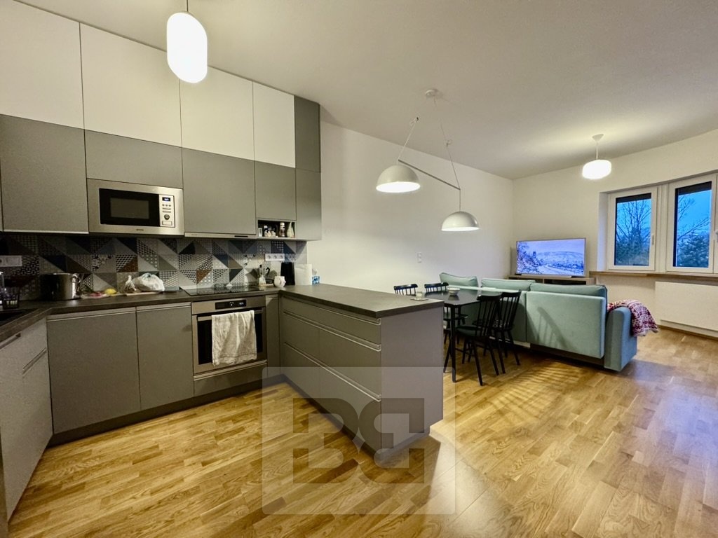 Byt prošel kompletní rekonstrukcí před dvěma lety – nové podlahy, moderní koupelna s vanou, samostatné WC a promyšlené úložné prostory v předsíni včetně elegantně skryté pračky.