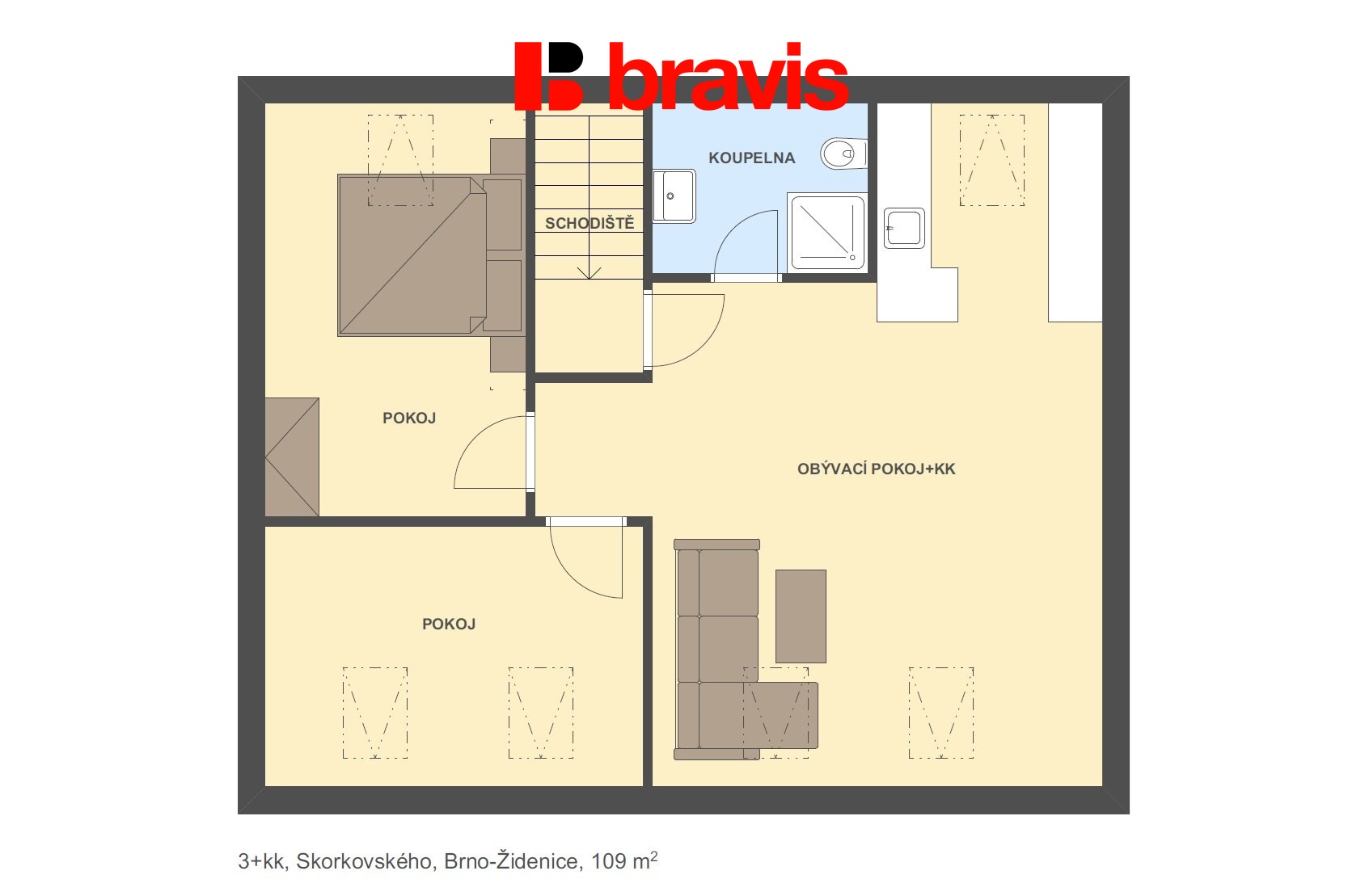 V zastoupení majitele nabízíme k dlouhodobému pronájmu kompletně zařízený byt o dispozici 3+kk na ulici Skorkovského v Brně-Židenicích.
