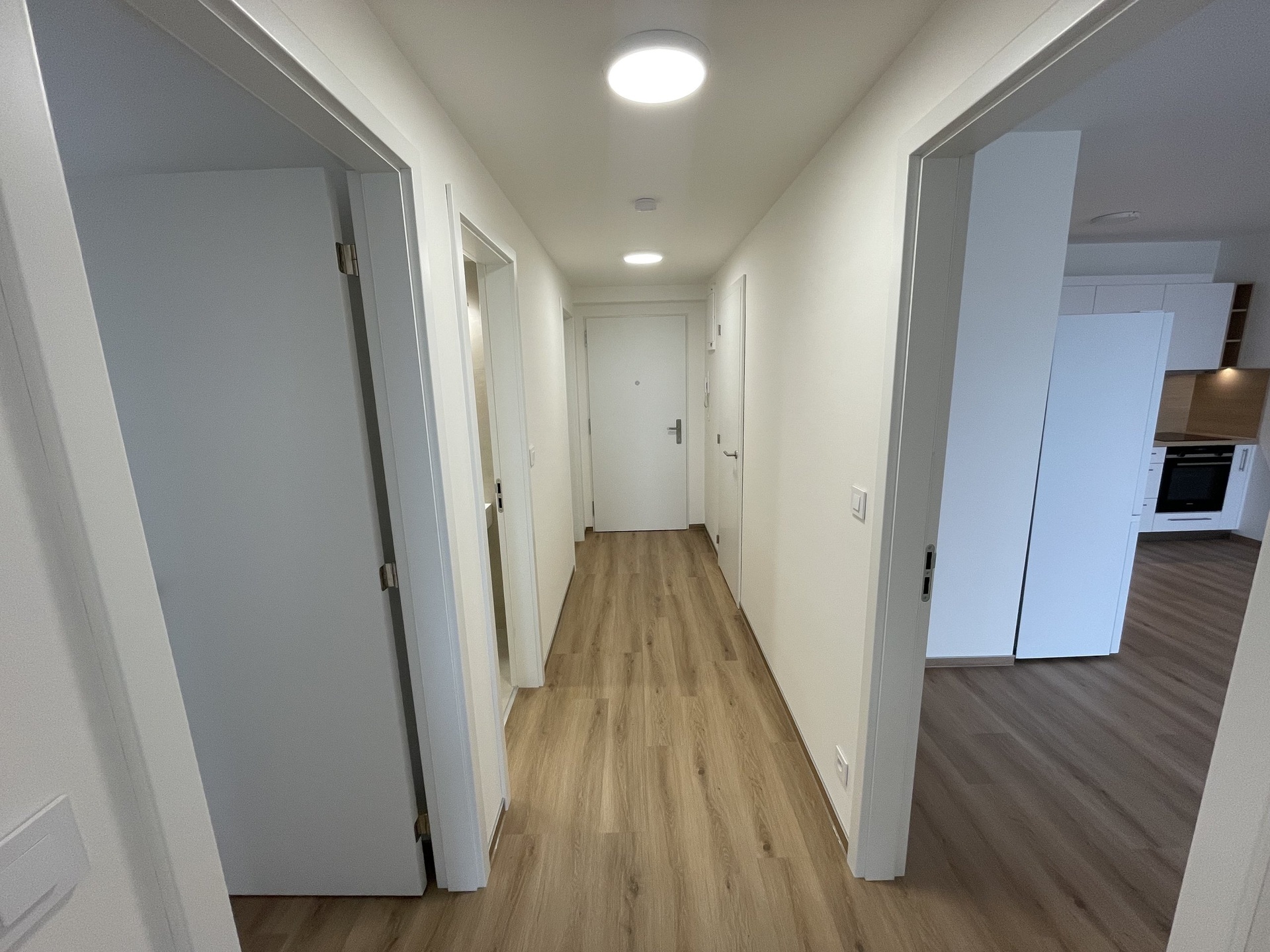 Dispozice: Předsíň, ložnice, dětský pokoj/pracovna, velká šatna, prostorný obývací pokoj se vstupem na balkon (4,6 m²) a s kuchyňským koutem, koupelna s vanou a samostatné WC.