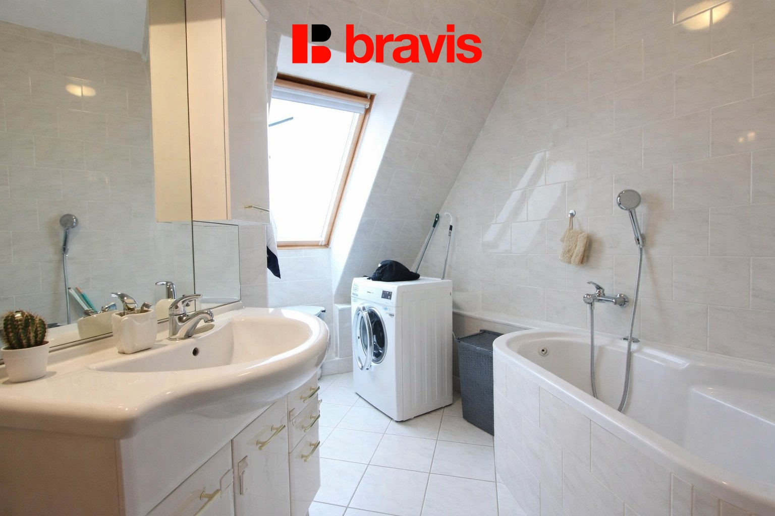 Koupelna je vybavena rohovou vanou – ideální pro dlouhé relaxační koupele po náročném dni – dále umyvadlem a pračkou. Toaleta je samostatná, což oceníte zejména v ranním shonu celé domácnosti.