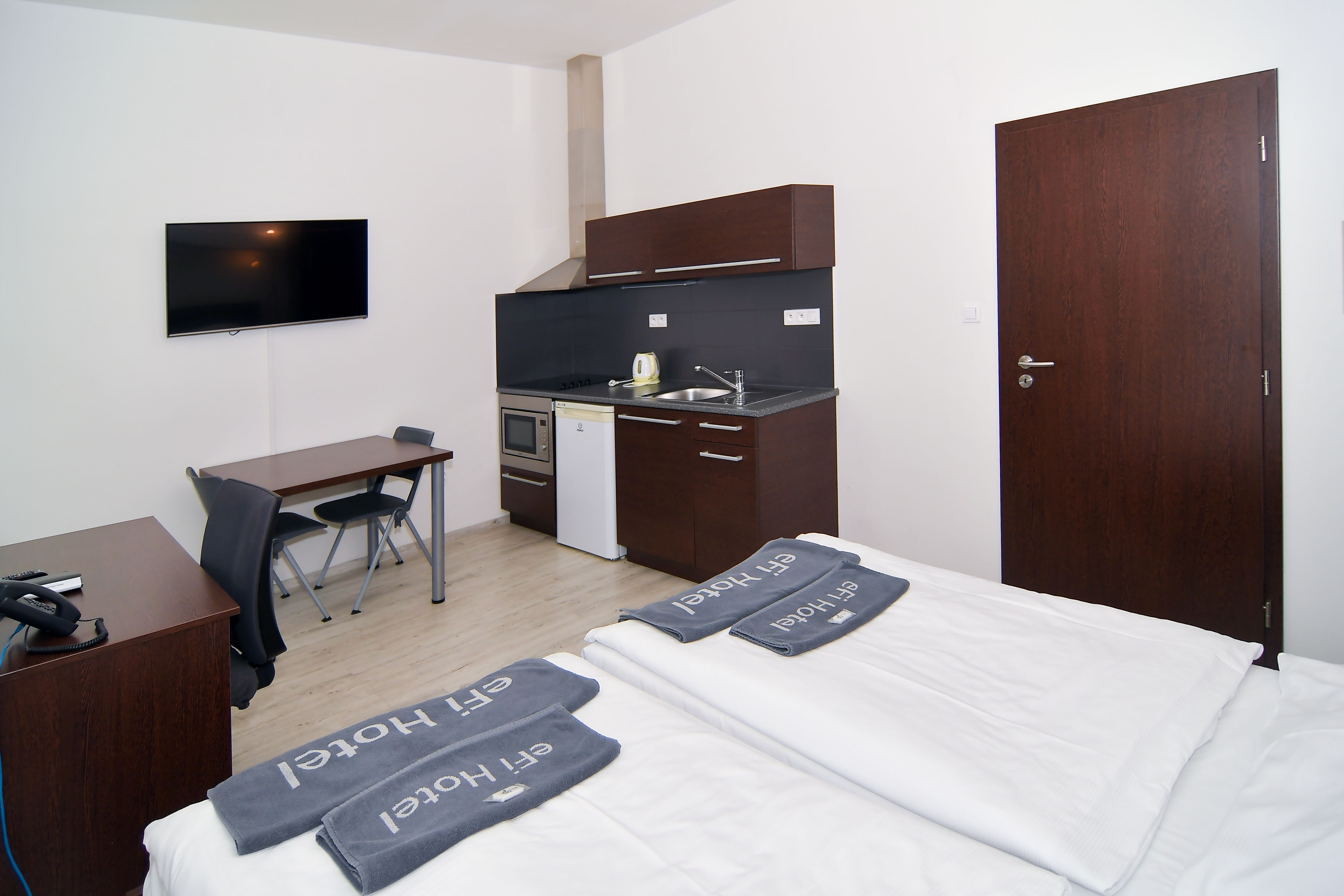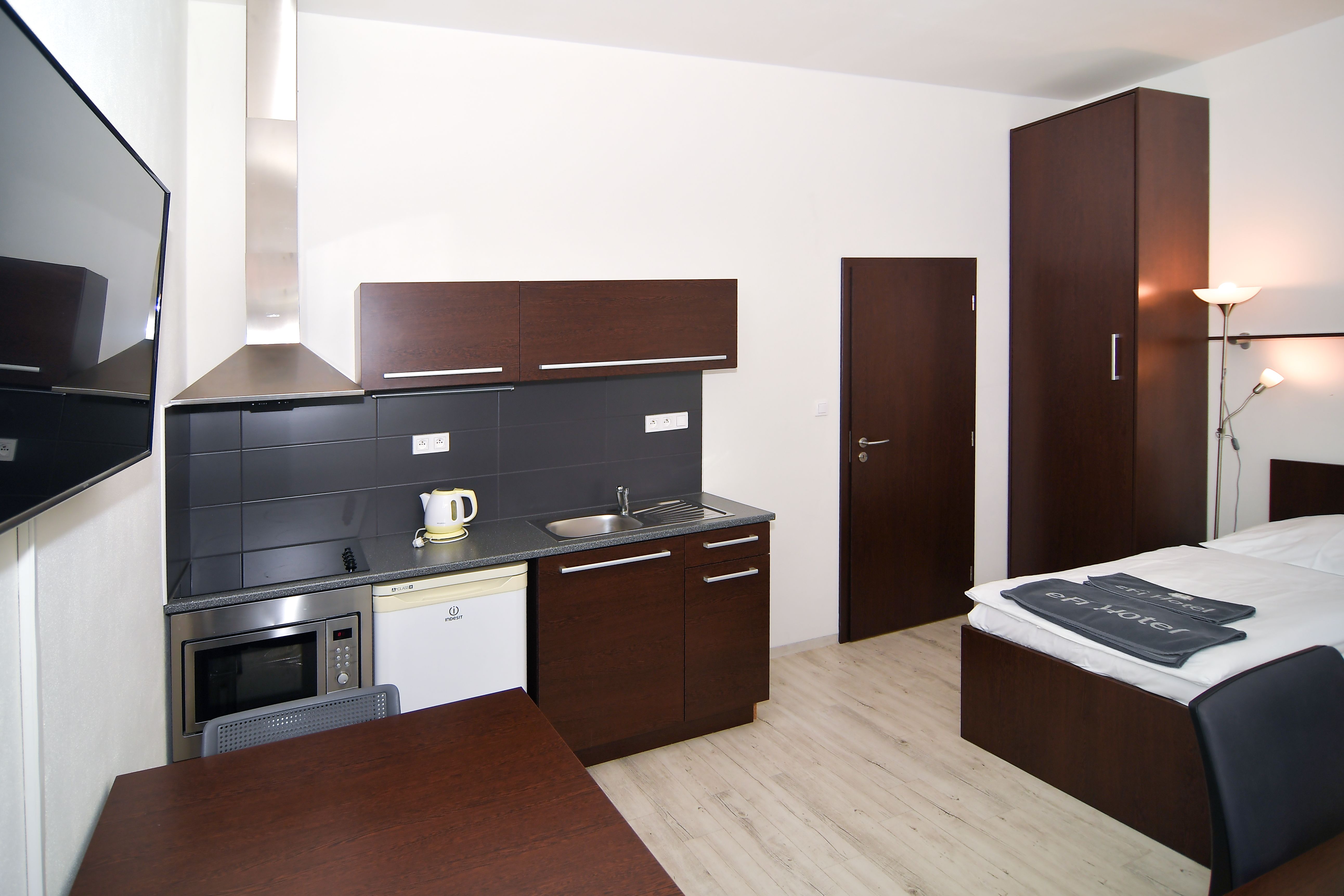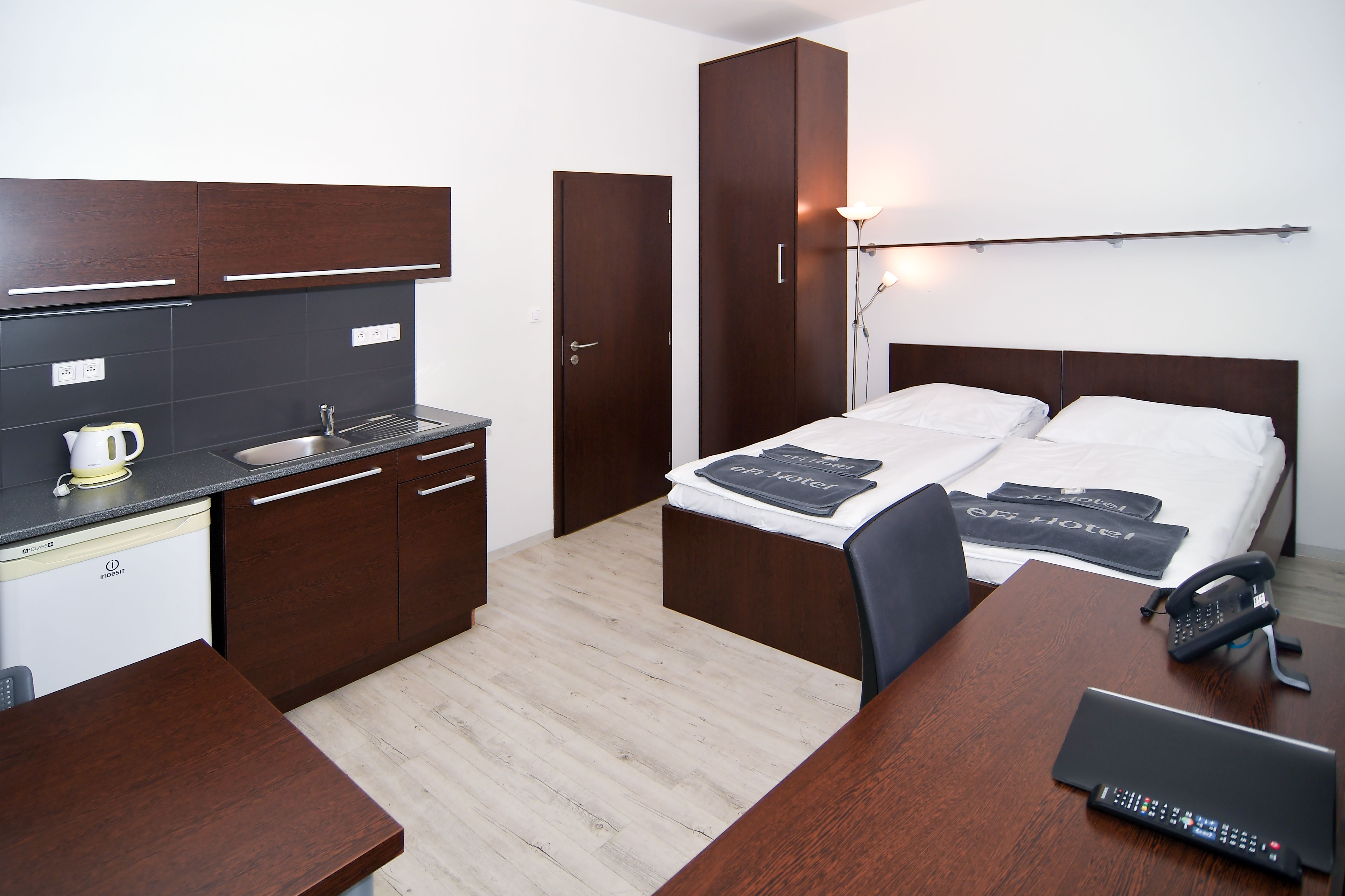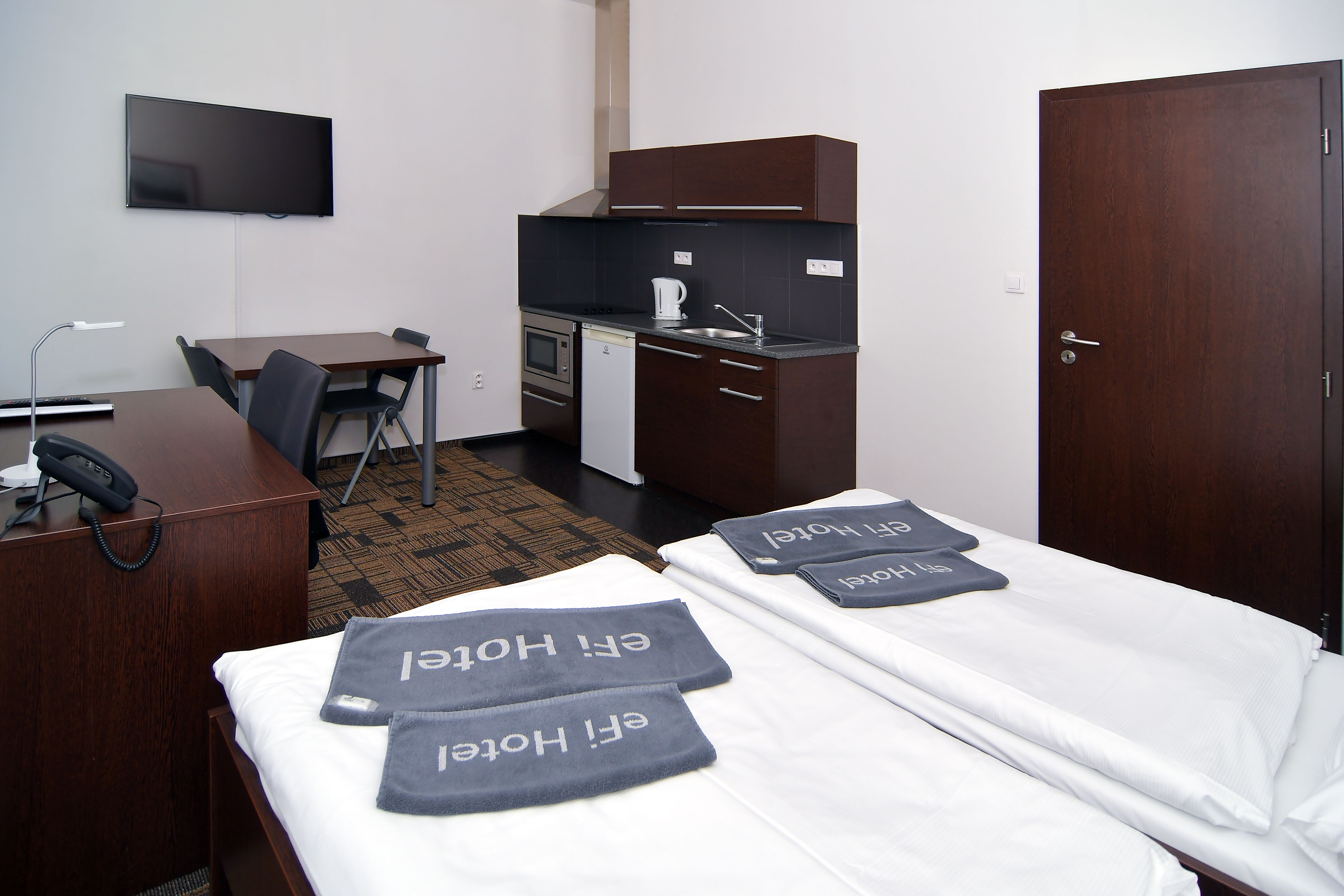 Kompletně zařízený byt. Pronájem na dobu od jednoho měsíce. Možnost pronájmu park. místa za 1 700 Kč měsíčně. Možnost pronájmu pračky za 500 Kč měsíčně. Pro studijní pobyty nabízíme pronájem plně zařízeného bytu 1+kk včetně kuchyňské linky a elektrospotřebičů v hotelovém komplexu eFi Palace Hotel v centru Brna.