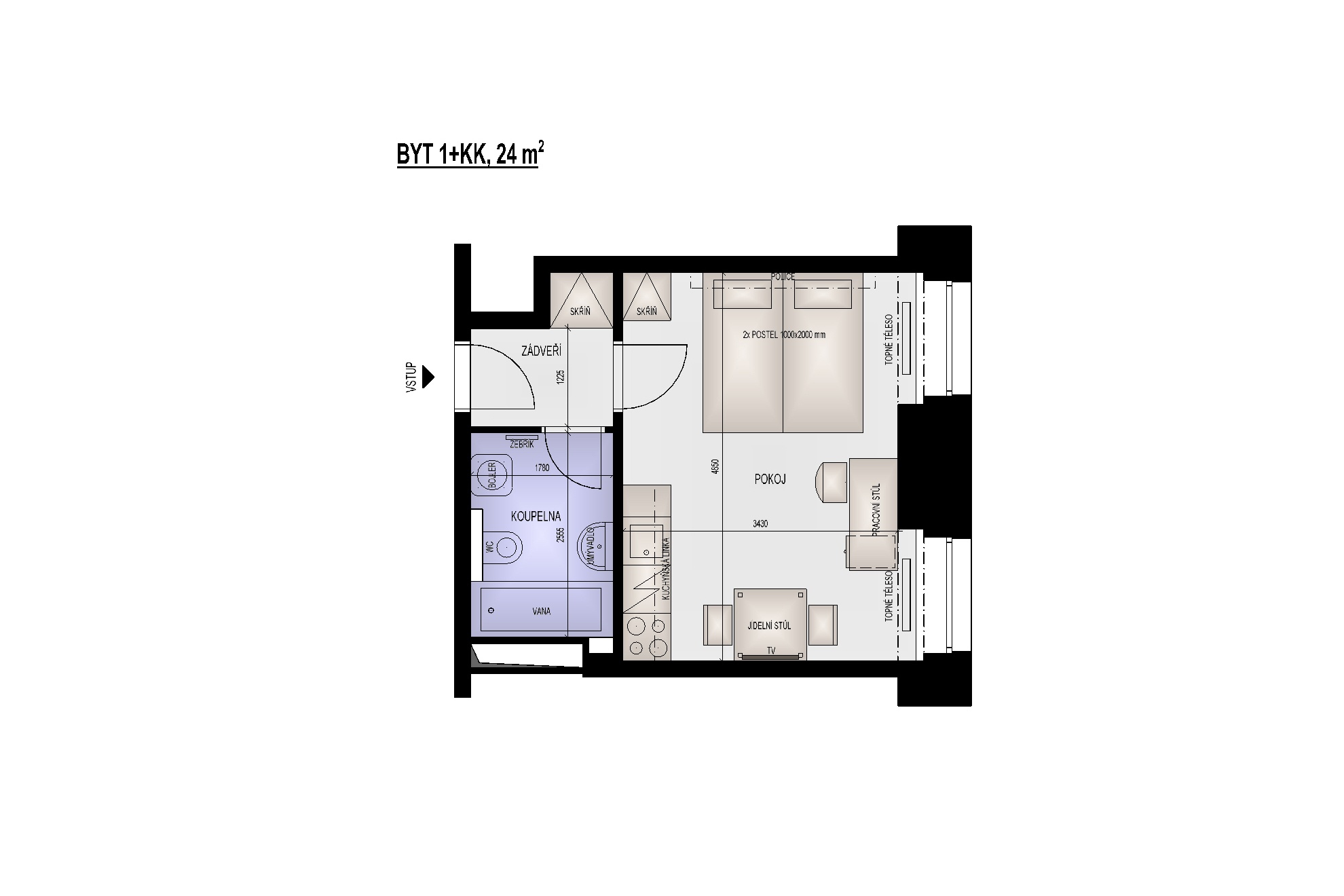 | Dispozice/podlahová plocha: | 1+kk/24 m² |