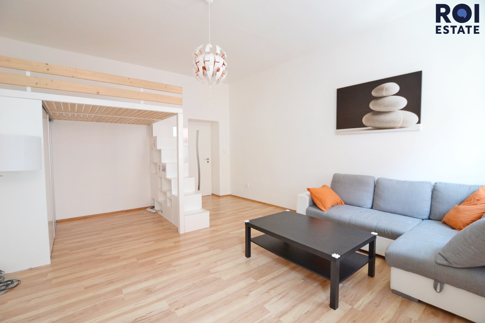 Veškeré vybavení je součástí podnájmu, těšit se můžete na speciální manželskou postel, která je na půl patra a velkou vestavěnou skříň. Dále je pak pokoj vybaven sedací soupravou a plně zařízeným kuchyňským koutem, který poskytne skvělý pocit z vaření. Koupelna nabízí pračku a sprchový kout. Nezapomeňte si povšimnou sladěného obložení. Velké vestavěné skříně se nachází také na chodbě, tudíž odkládacích prostor je mnoho.