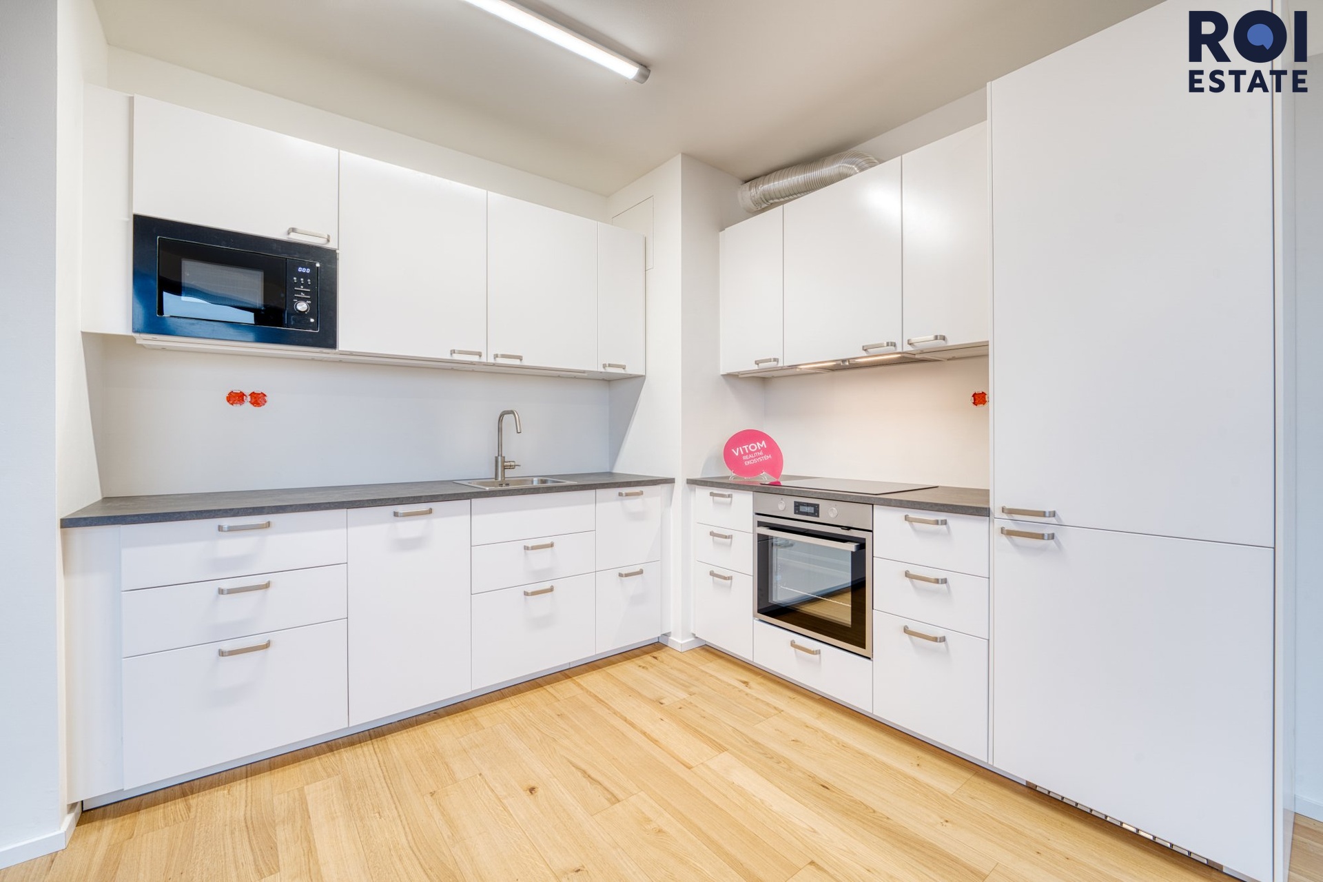 Kuchyňská linka je plně vybavena vestavnými spotřebiči – nechybí trouba, varná deska, myčka ani lednice.