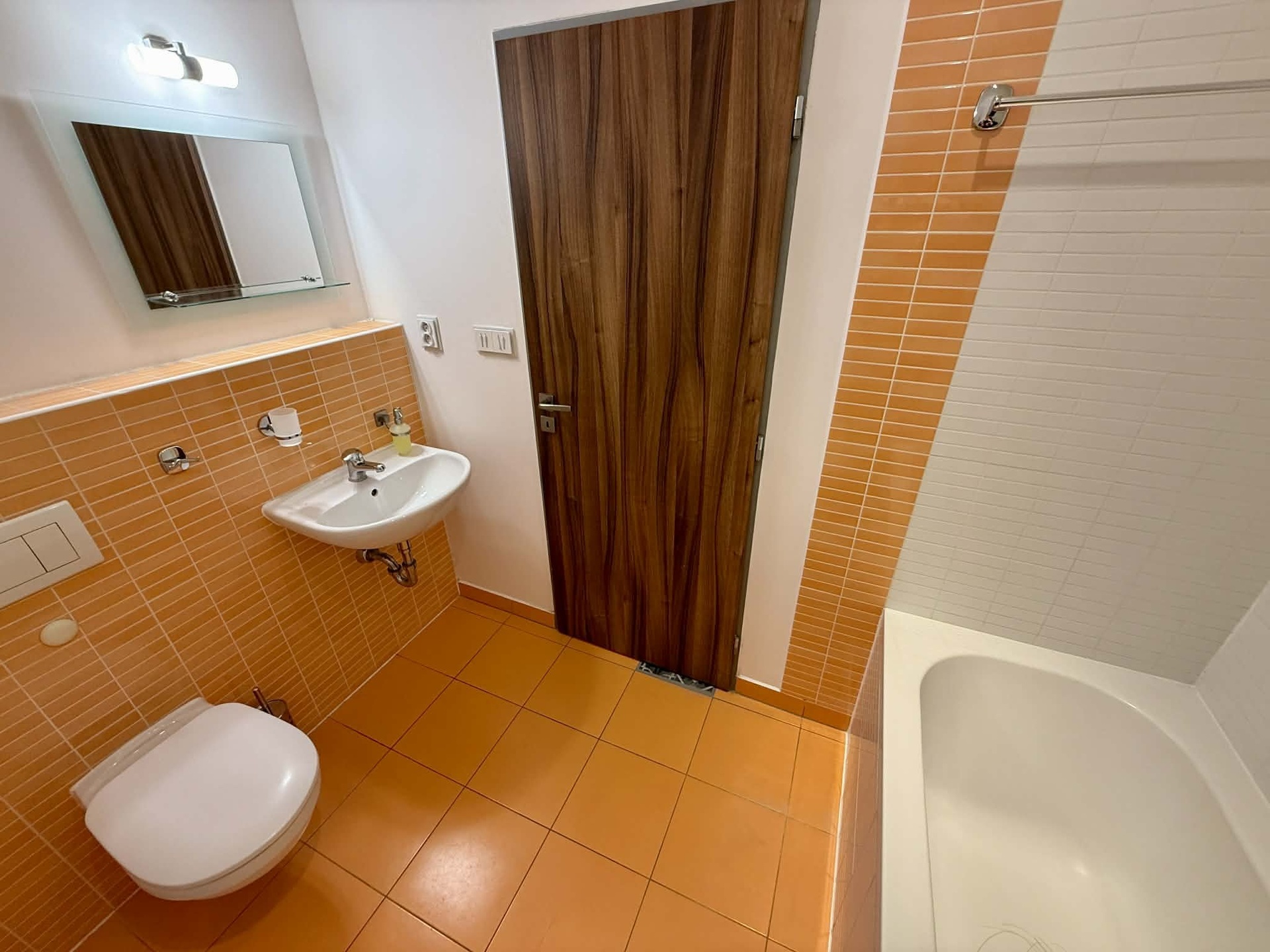 • koupelna s WC (vana, umyvadlo, zrcadlo s poličkou, závěsné WC, el. topný žebřík, chromový program, větrák)