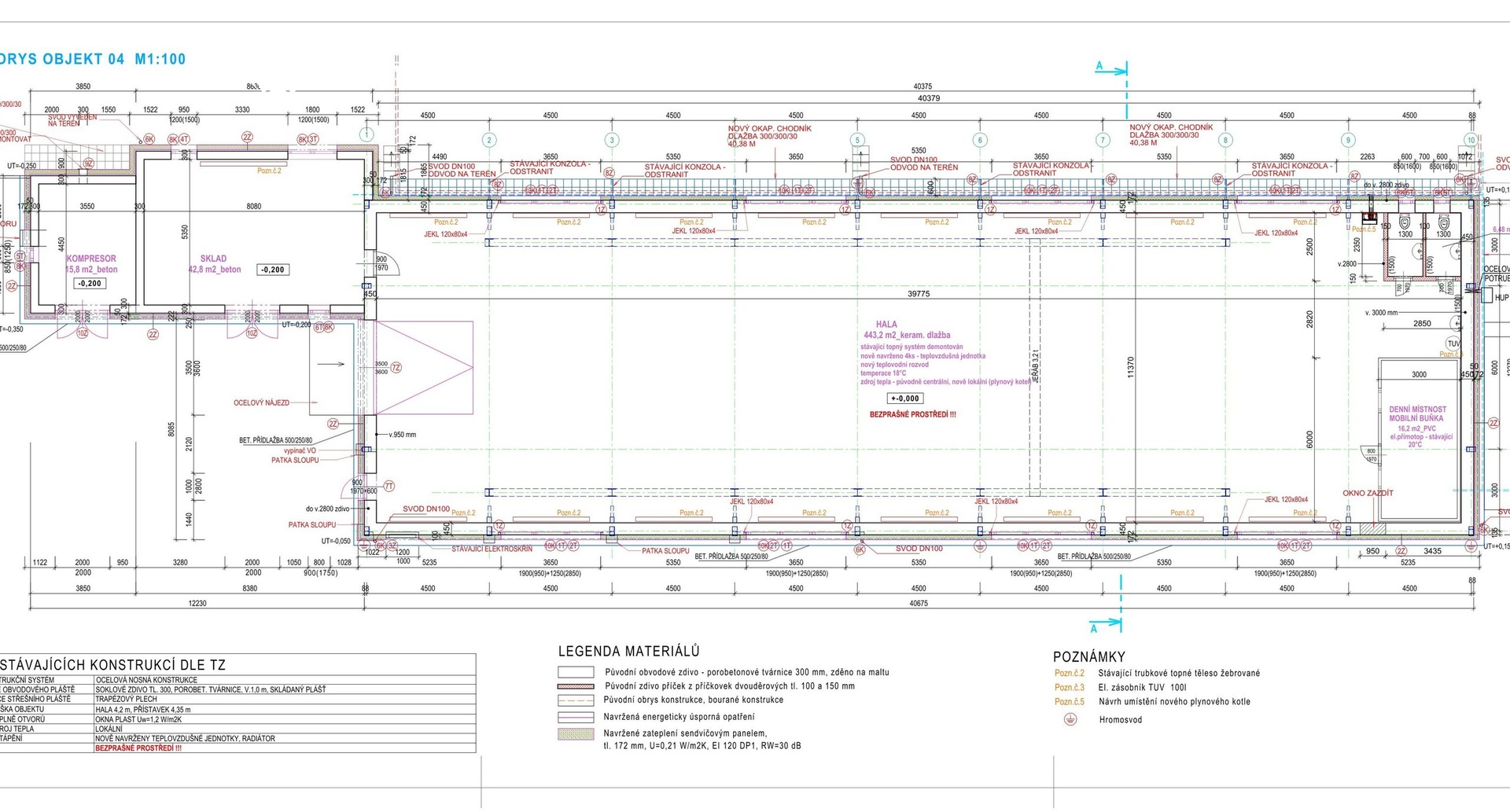 hala 443 m²; sklad 42,8 m²; sklad 15,8 m²; soc. zázemí 6,5 m²