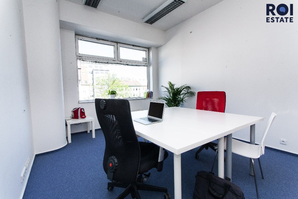 Prostor tvoří dvě samostatné místnosti, které lze využít jako oddělené kanceláře, případně jako pracovní část a jednací místnost. Díky velkým oknům je interiér příjemně prosvětlený, podlahu pokrývají zátěžové koberce, které zajišťují komfort i dobrou akustiku.