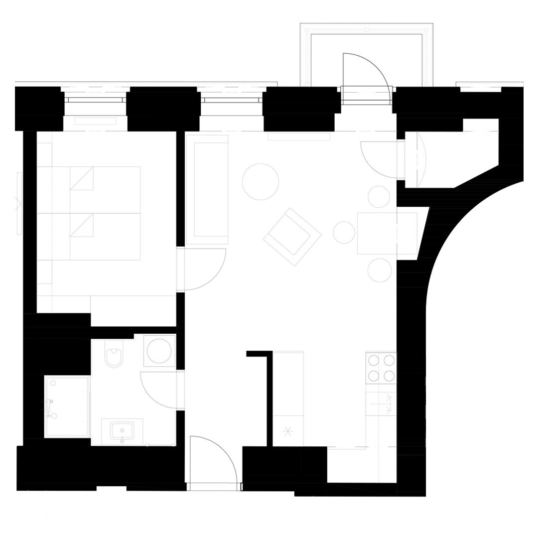 Apartmán se pronajímá částečně vybavený – k dispozici je nová kuchyňská linka s elegantní kombinací černé a dřeva, včetně spotřebičů (myčka, lednice, varná deska, trouba, mikrovlnka). Obytný prostor působí vzdušně díky vysokým oknům a světlým podlahám. Koupelna je moderní a prostorná – sprchový kout, umyvadlová skříňka, toaleta a pračka.