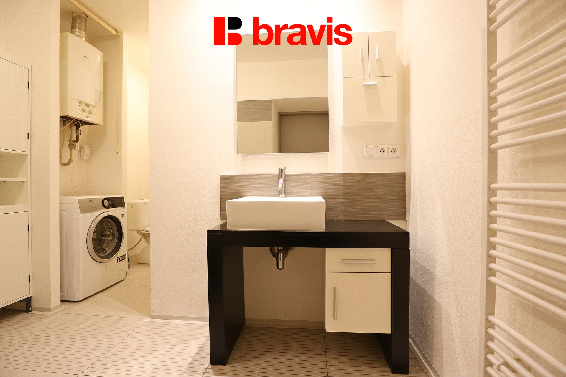 V koupelně je vana, umyvadlo, pračka, toaleta oddělena příčkou (viz plánek bytu) a kombinovaný plynový kotel, který slouží na vytápění bytu a ohřev vody.