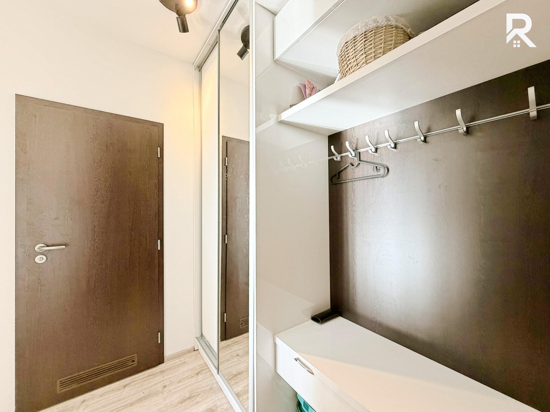 Samotný byt se nachází ve 3. NP cihlové novostavby a při příchodu Vás přivítá předsíň s praktickým úložným prostorem v podobě vestavěných skříní. Byt je celkově vybaven na míru řešeným vestavěným nábytkem v obývací části, kuchyni i předsíni, což zajišťuje dostatek úložného prostoru a maximálně efektivní využití dispozice.