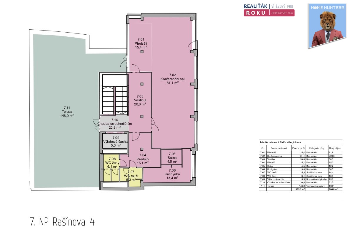 V rámci užitné plochy 140,9 m2 je k dispozici celé 7.NP, které novým nájemníkům nabízí velký open-space prostor o velikosti 96,5 m2 s plátnem na projektor (původně prostor sloužil jako velká konferenční místnost). V rámci zázemí kanceláře jsou pak k dispozici oddělené pánské a dámské toalety, prostorná kuchyňská se spotřebiči a malá místnost, která může sloužit např. jako šatna, navolávací místnost, apod.. Velký open-space je teoreticky možné příčkami rozdělit na menší prostory, pokud to uznáte za vhodné.