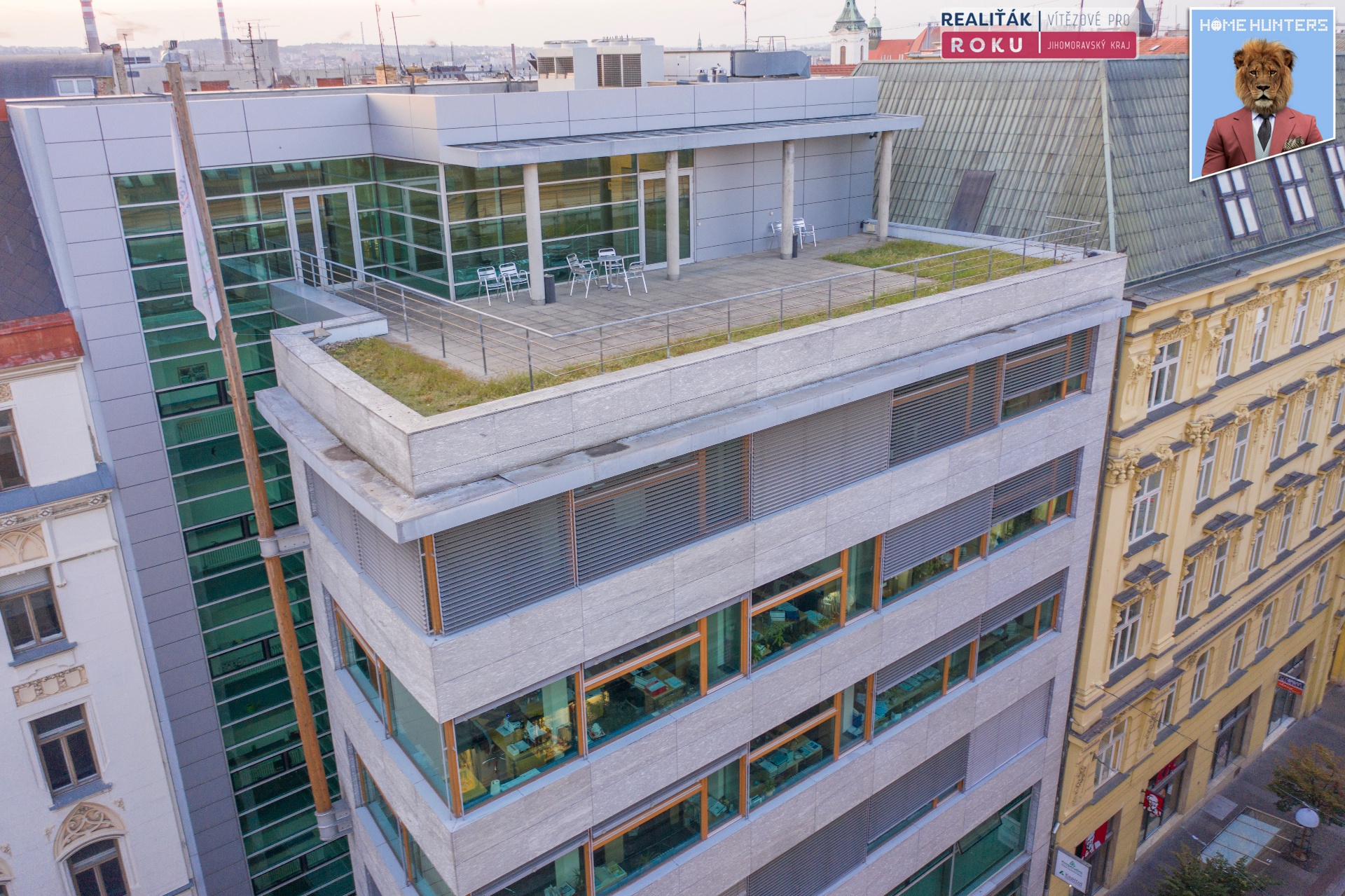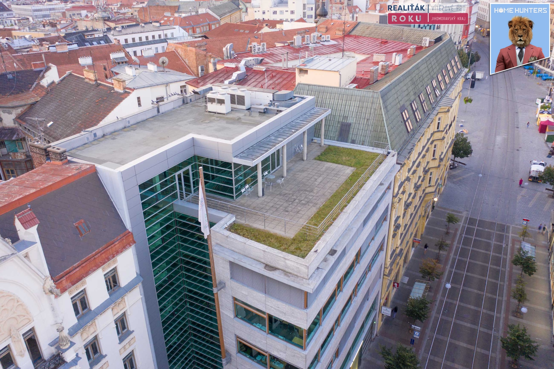 Jedinečná možnost pronájmu prostorné open-space kanceláře v posledním patře moderní budovy na ulici Rašínova s vlastní terasou s výhledem na celé centrum Brna!