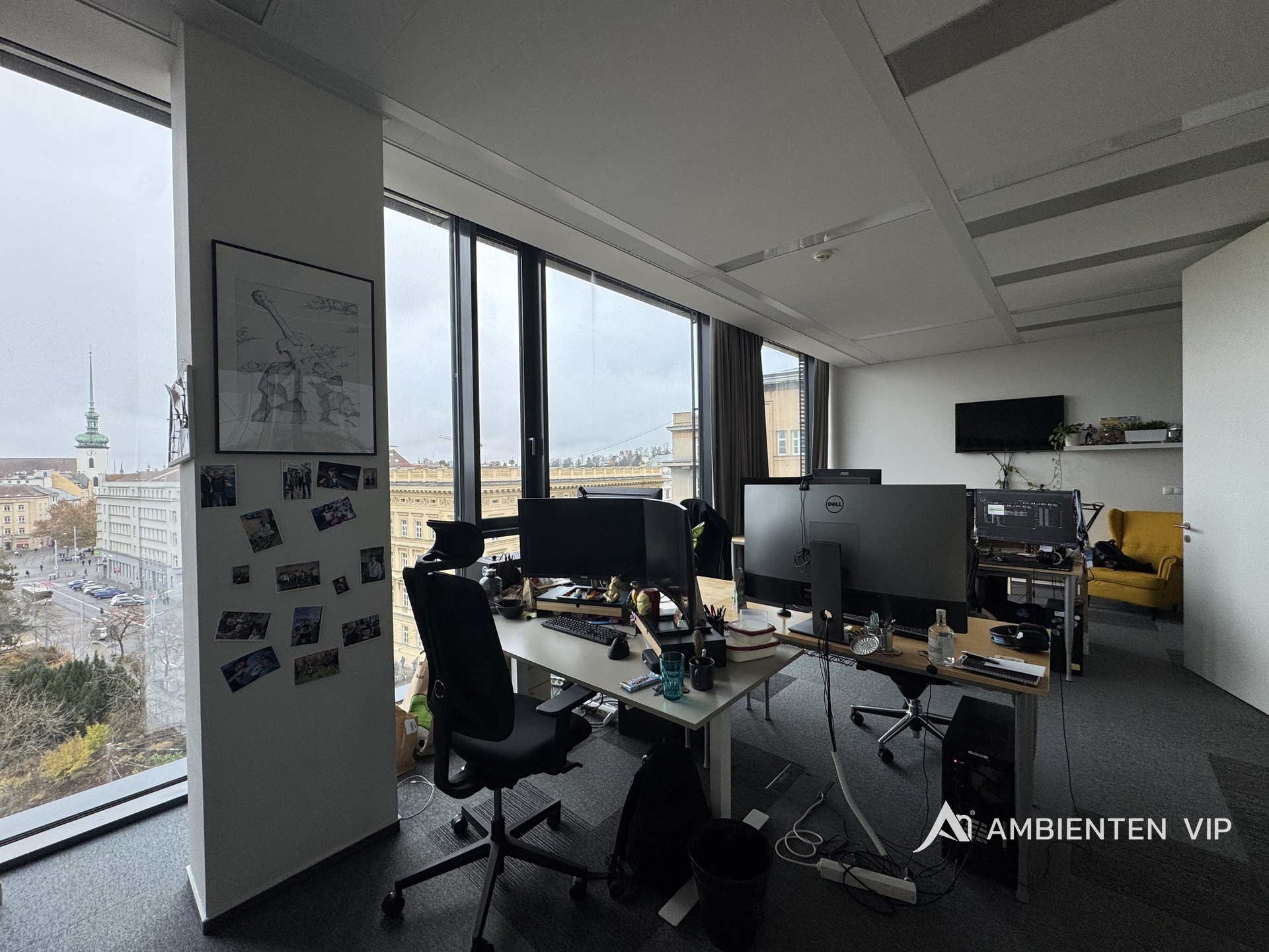 Kanceláře se nachází v reprezentativním administrativním objektu se vstupem přímo z ulice, výtahem a bezbariérovým přístupem. Budova nabízí recepci s provozem 24/7, ostrahu a kamerový systém, a to v rozsahu dle zvolené nabídky. Samotný prostor je navržen s důrazem na efektivní provoz a komfort pracovního prostředí. K dispozici je plně vybavená kuchyň s jídelním stolem a posezením, sociální zázemí, 3 uzavřené kanceláře pro přibližně 8–10 osob, 1 menší kancelář vhodná pro 1–3 osoby nebo jako klidová zóna, sdílené pracovní a relaxační posezení s výhledem na Moravské náměstí a celé Brno. K dispozici jsou dále dva call boxy, hlavní zasedací místnost pro cca 10 osob, menší zasedací místnost pro 3 osoby a samostatná šatna.
