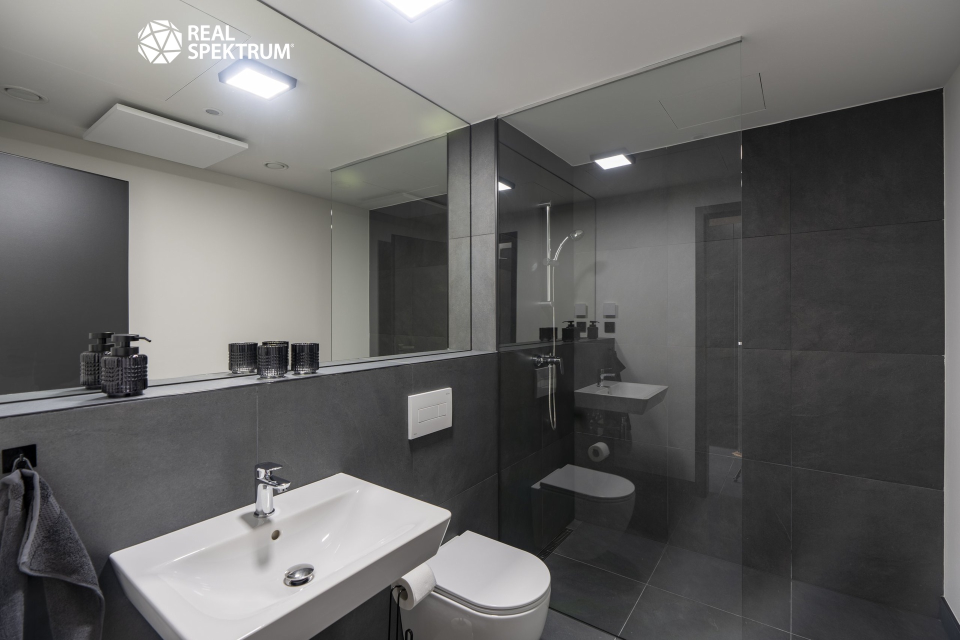 • moderní koupelna se sprchou, umyvadlem a WC