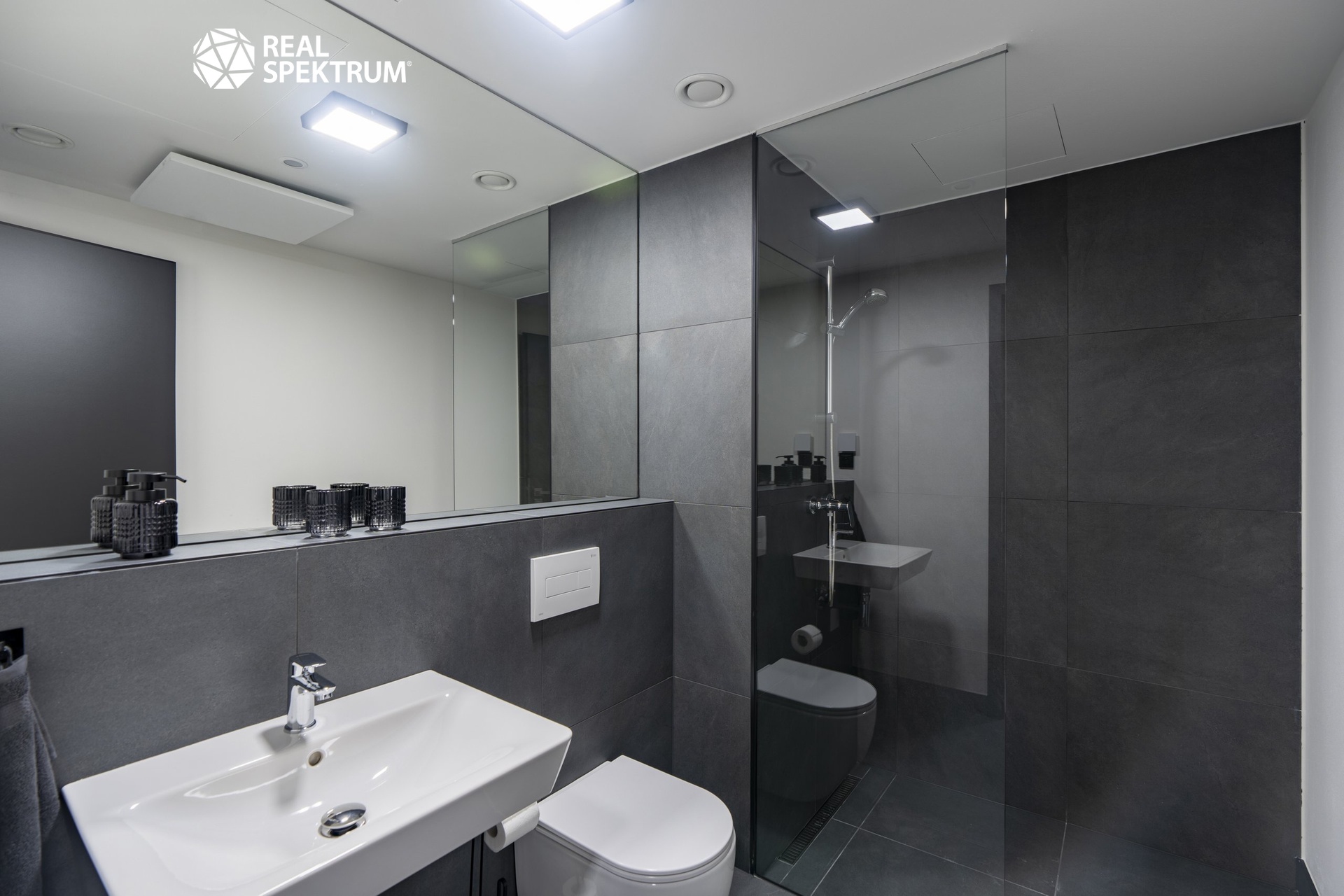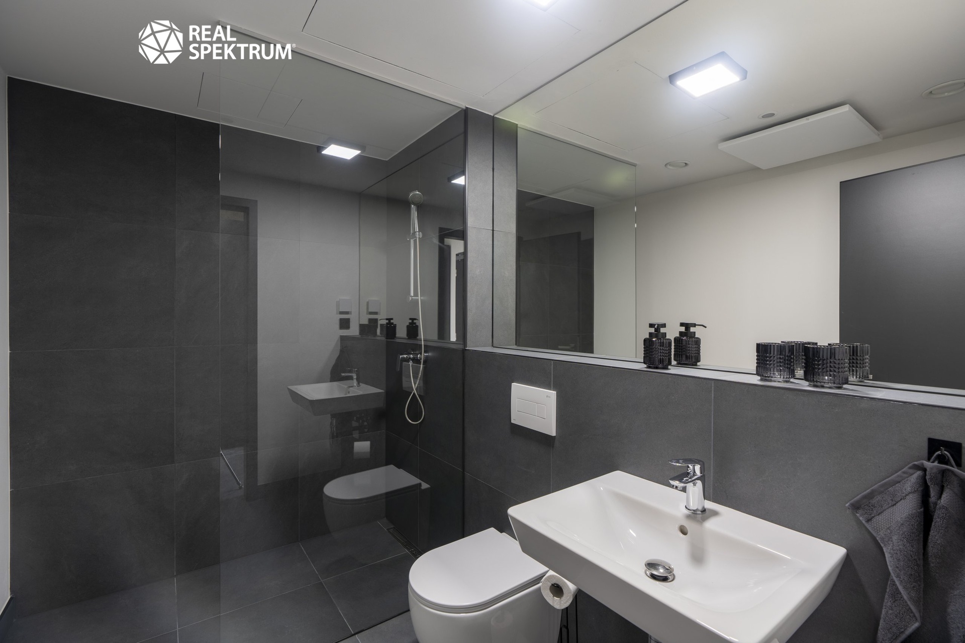 • moderní koupelna se sprchou, umyvadlem a WC