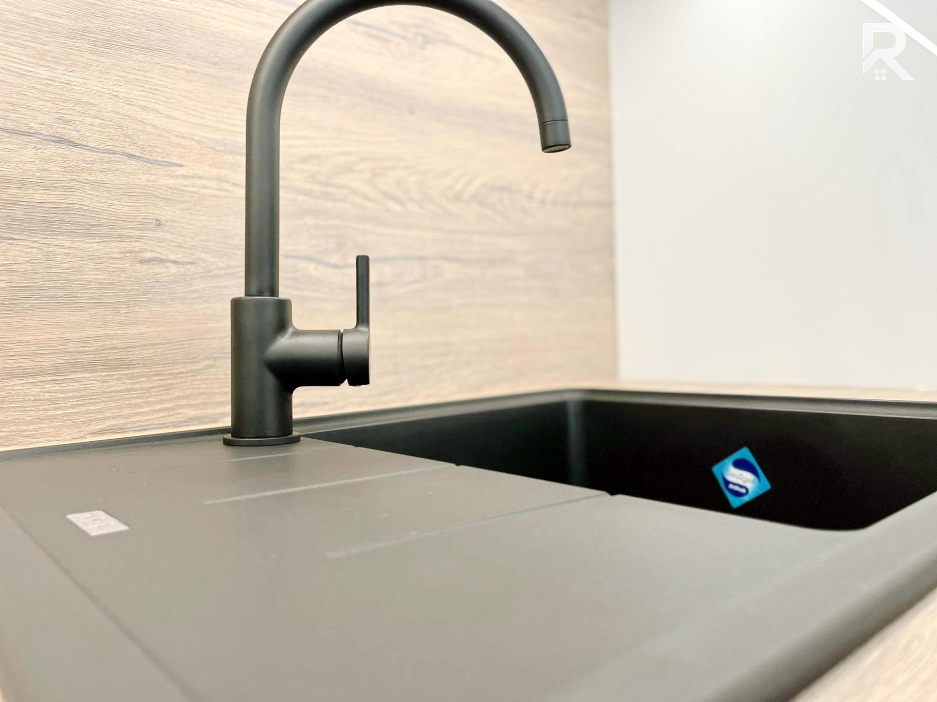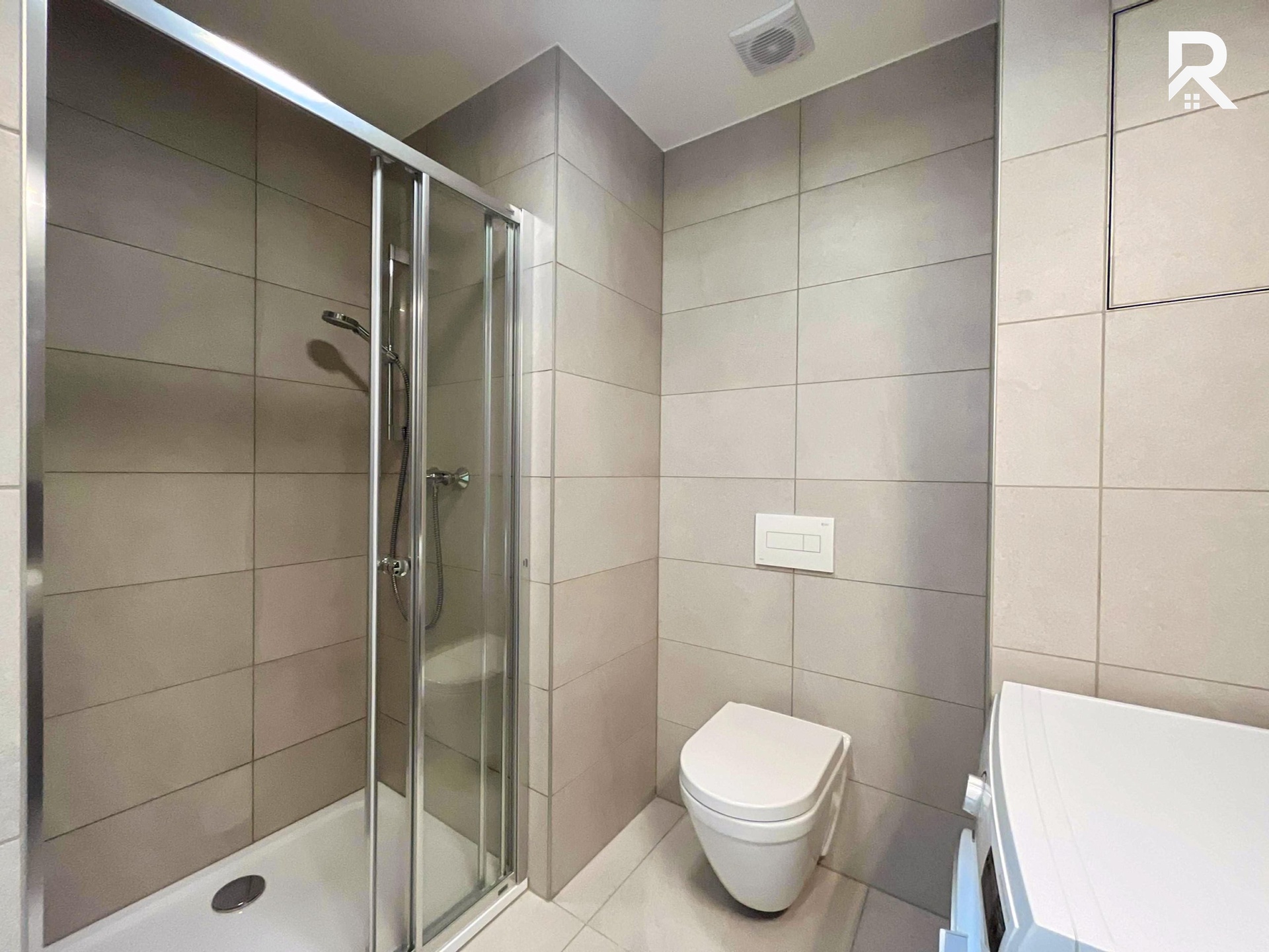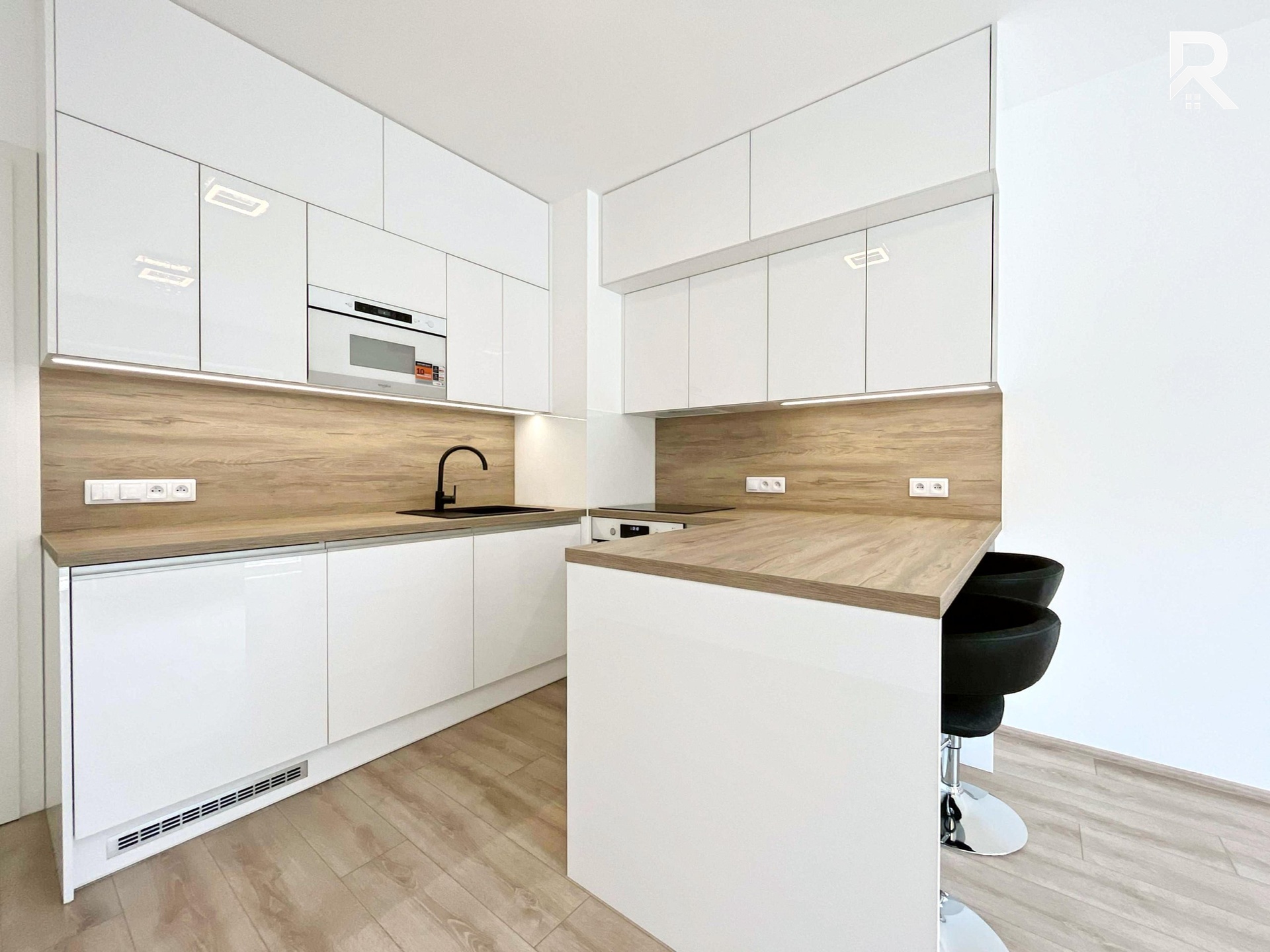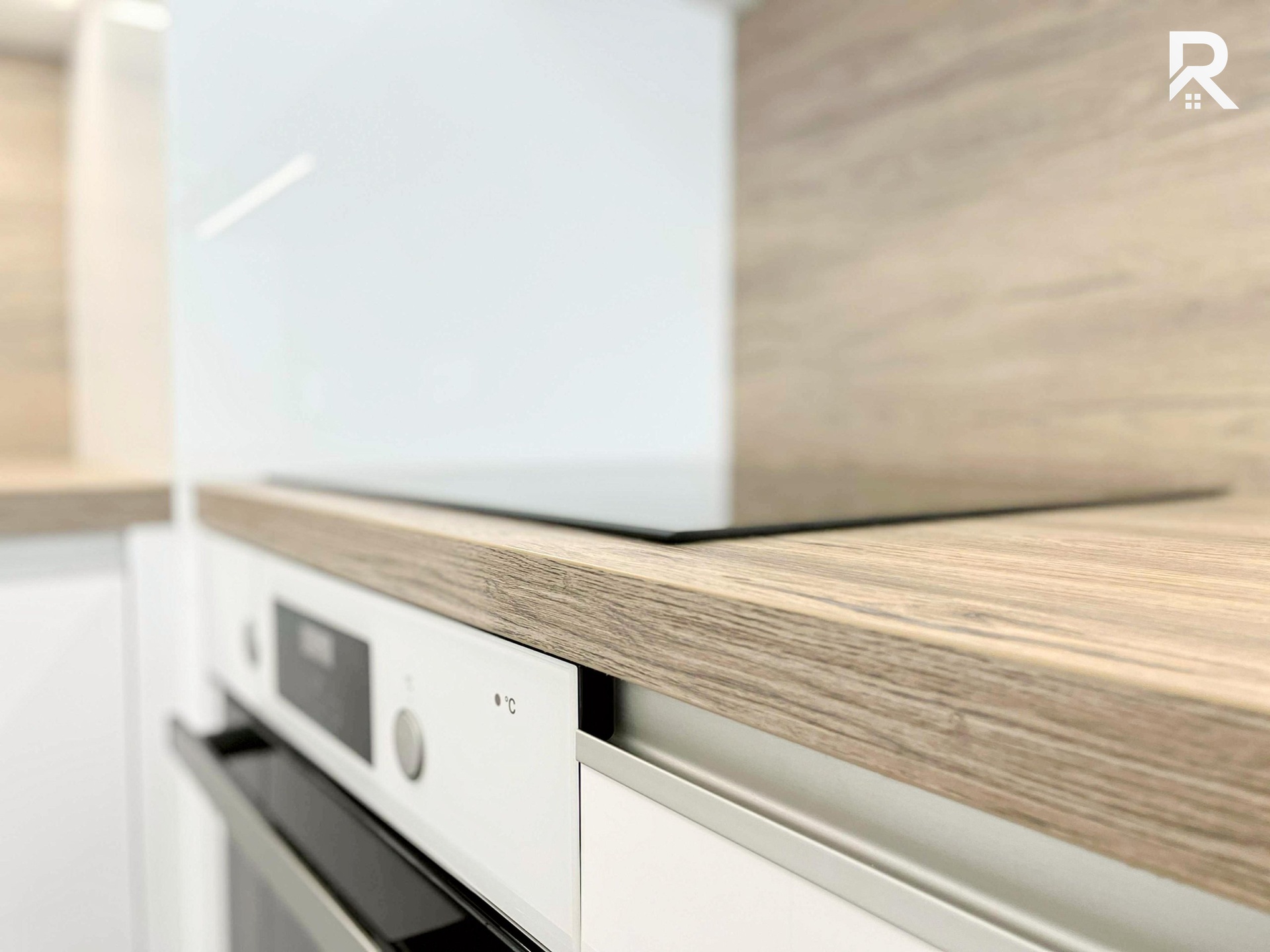 V samotném bytě Vás uvítá chodba s vestavěnými prvky jako je lavice, odklad na kabáty a také úložný prostor, kterého není nikdy dost. Naší první zastávkou je designová koupelna se skříňkou i zrcadlem na míru, nachází se zde také závěsné WC, pračka a také sprchový kout. Samotnému obývacímu prostoru s kuchyňským koutem skutečně dominuje kuchyňská linka od truhláře na míru, která disponuje spotřebiči jako je indukční deska, menší lednice s mrazákem, myčka, mikrovlnná trouba a samozřejmě také horkovzdušná trouba. Pokud tedy rádi vaříte, nic Vám nebude chybět ke spokojenosti. Vzhledem k tomu, že se zde myslelo skutečně na vše, nachází se zde také prodloužení v rámci kuchyňské linky a barových židliček. Prostor je navržený tak, že v případě toho, že si pořídíte kancelářskou židli, budete to brát jako plnohodnotnou pracovnu. K úplnému štěstí Vám bude již chybět jen postel či případně rozkládací gauč, který si do prostoru můžete navrhnout dle Vašich představ.