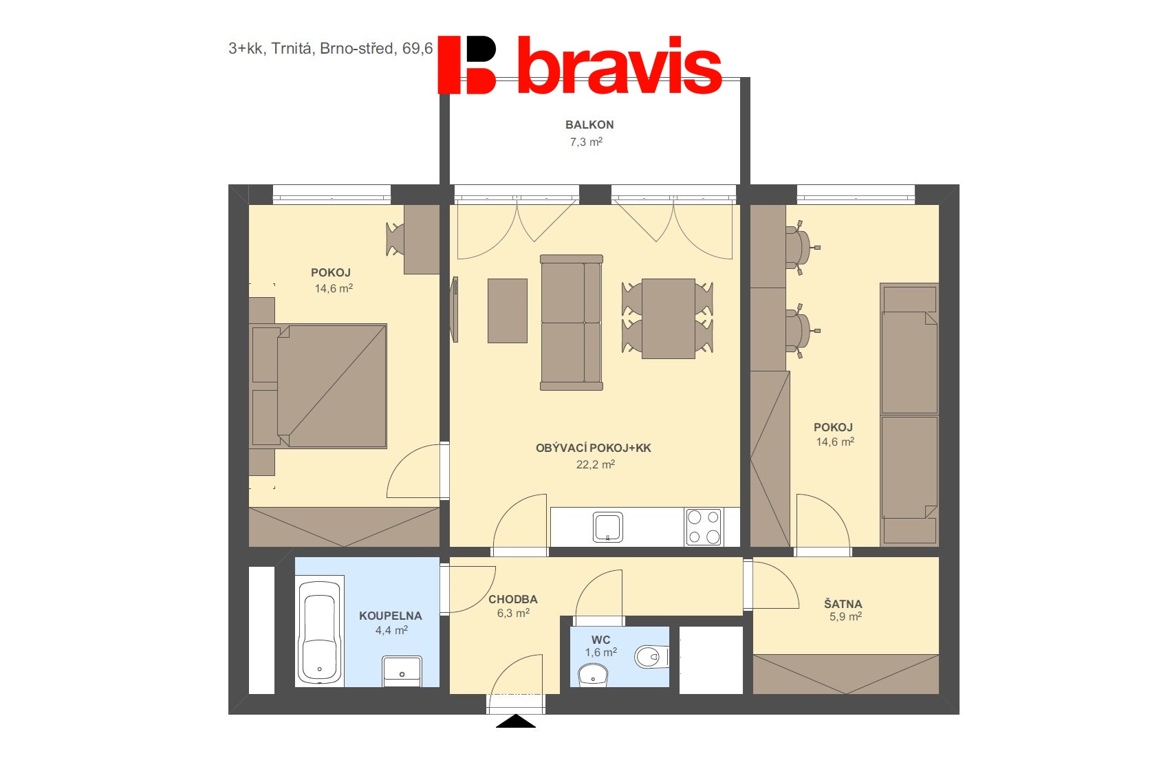 - Dispozice bytu: 3+kk
