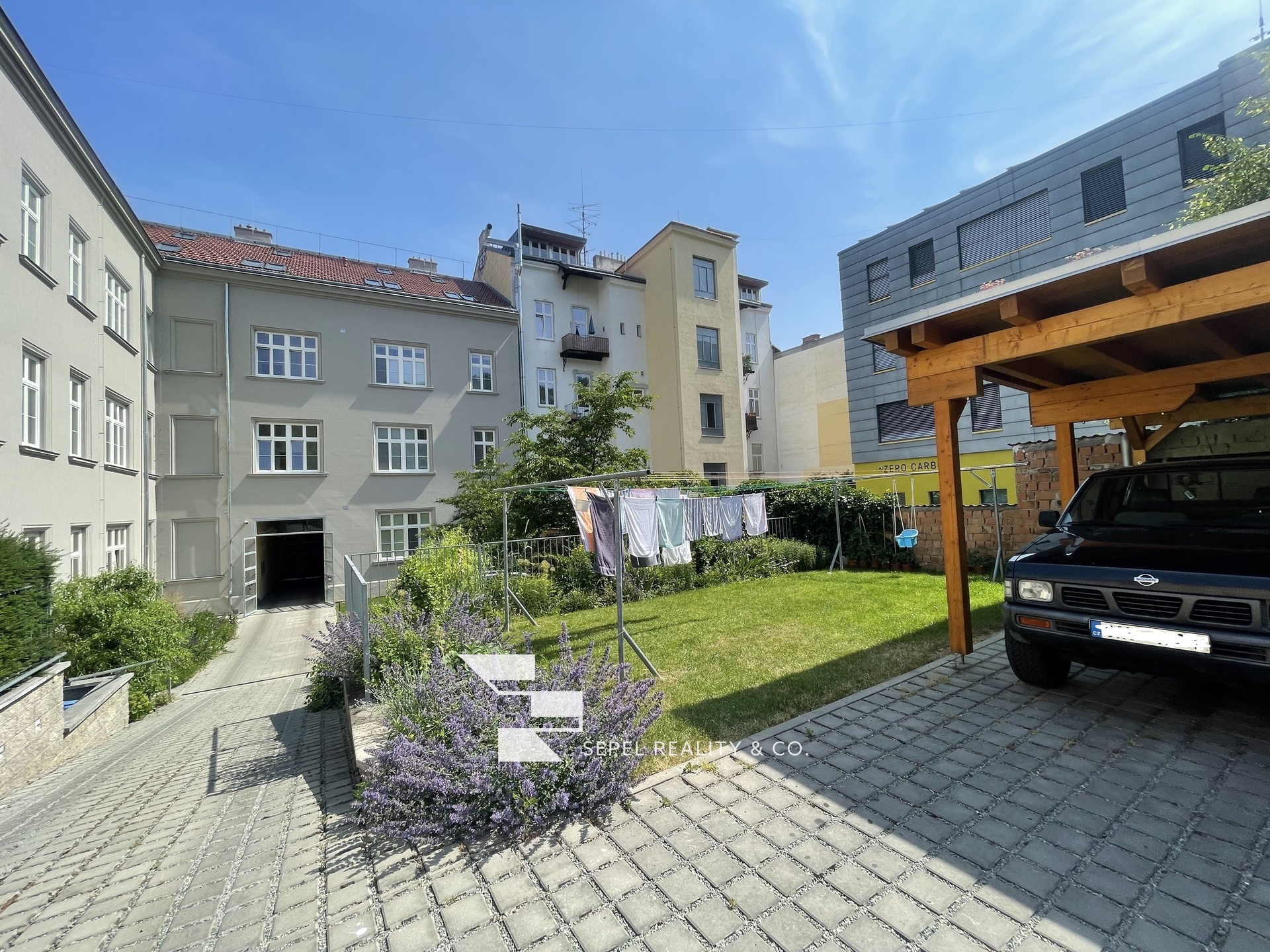 Byt se nachází v klasickém nájemním domě, k dispozici je i společná zahrada ve vnitrobloku s výhledem na Špilberg.