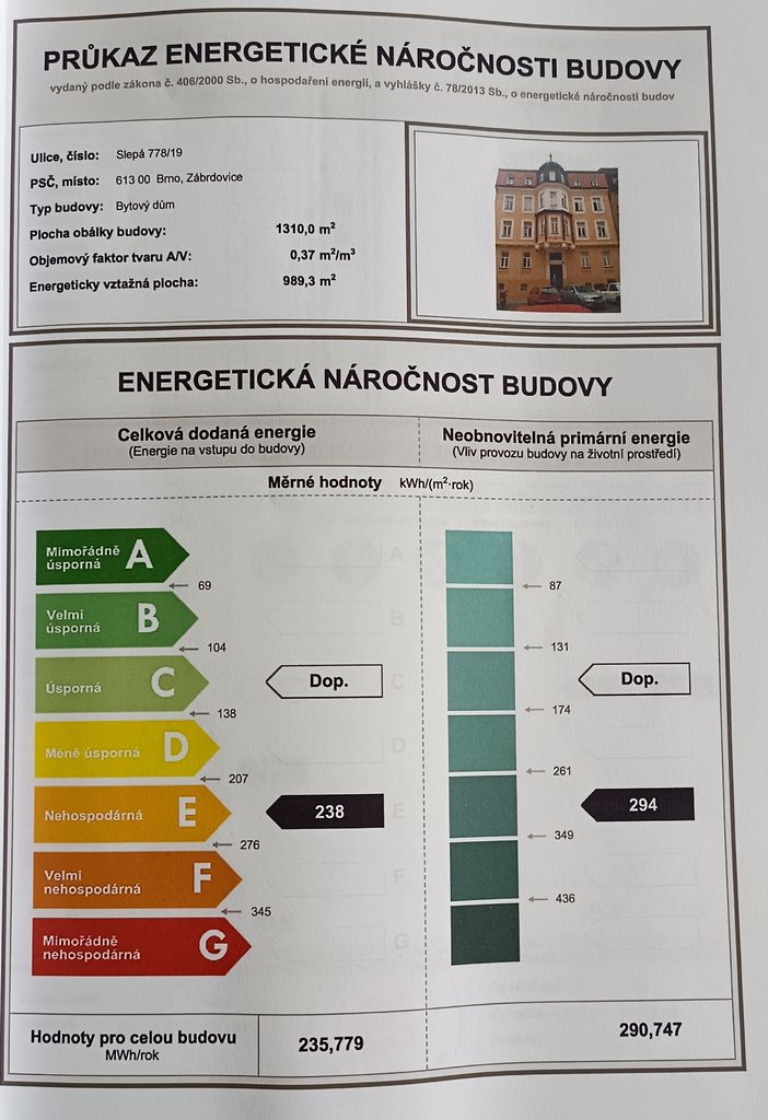 - Ukazatel energetické náročnosti budovy: 235 kWh/m²