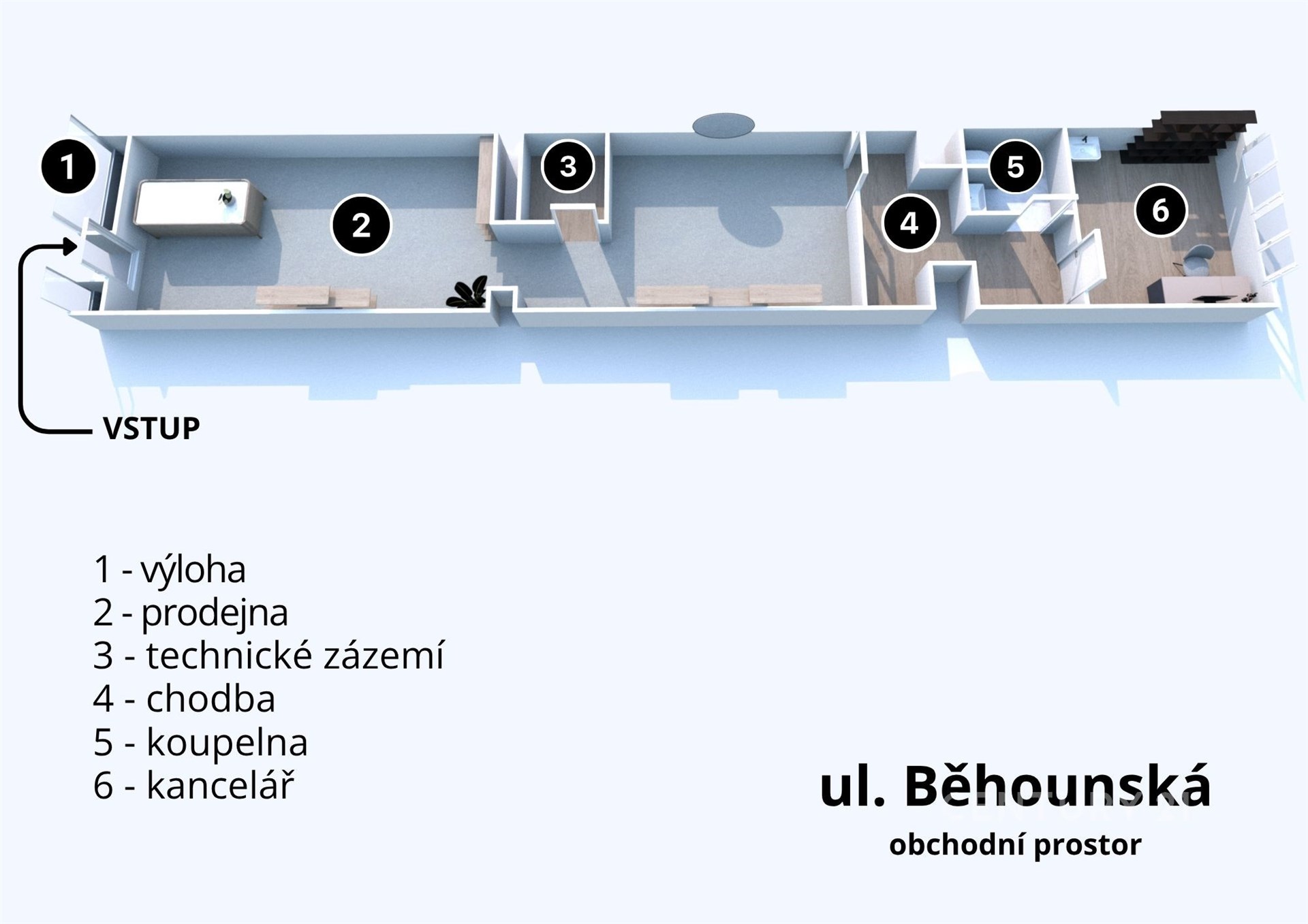 K pronájmu nabízím obchodní prostor o celkové výměře 76 m² na ulici Běhounská v centru Brna. Prostor se vstupem přímo z ulice nabízí velmi dobrou viditelnost i reprezentativní zázemí pro podnikání. Velkou předností prostoru je prosklená výloha a reklamní plocha do ulice Běhounská, hned u náměstí Svobody, což zajišťuje velmi dobrou viditelnost i atraktivní prezentaci podnikání.
