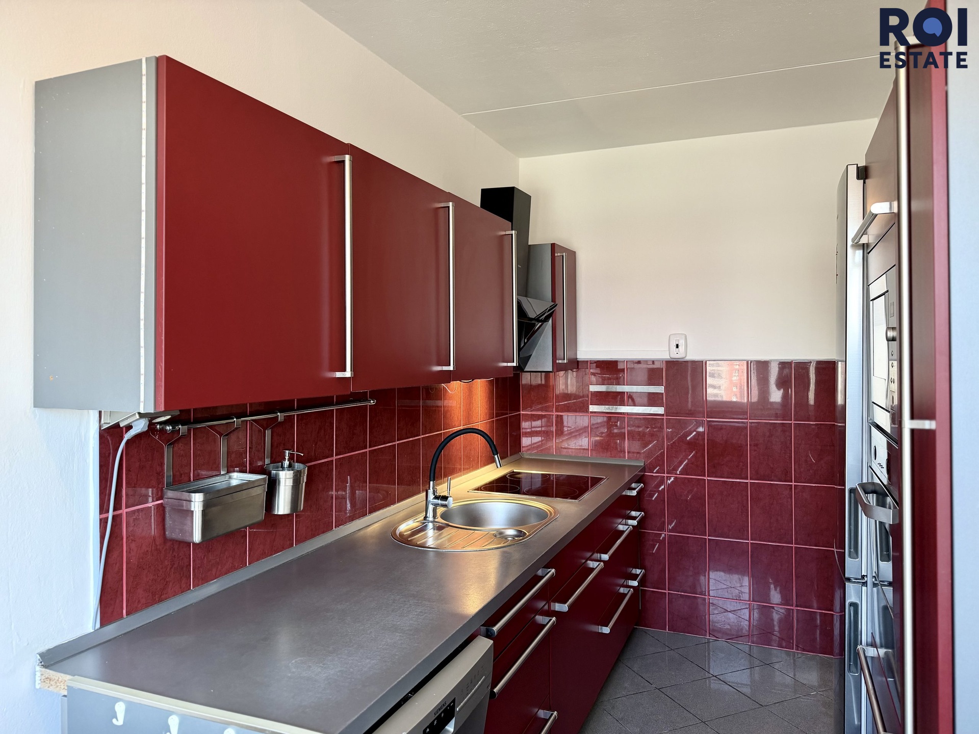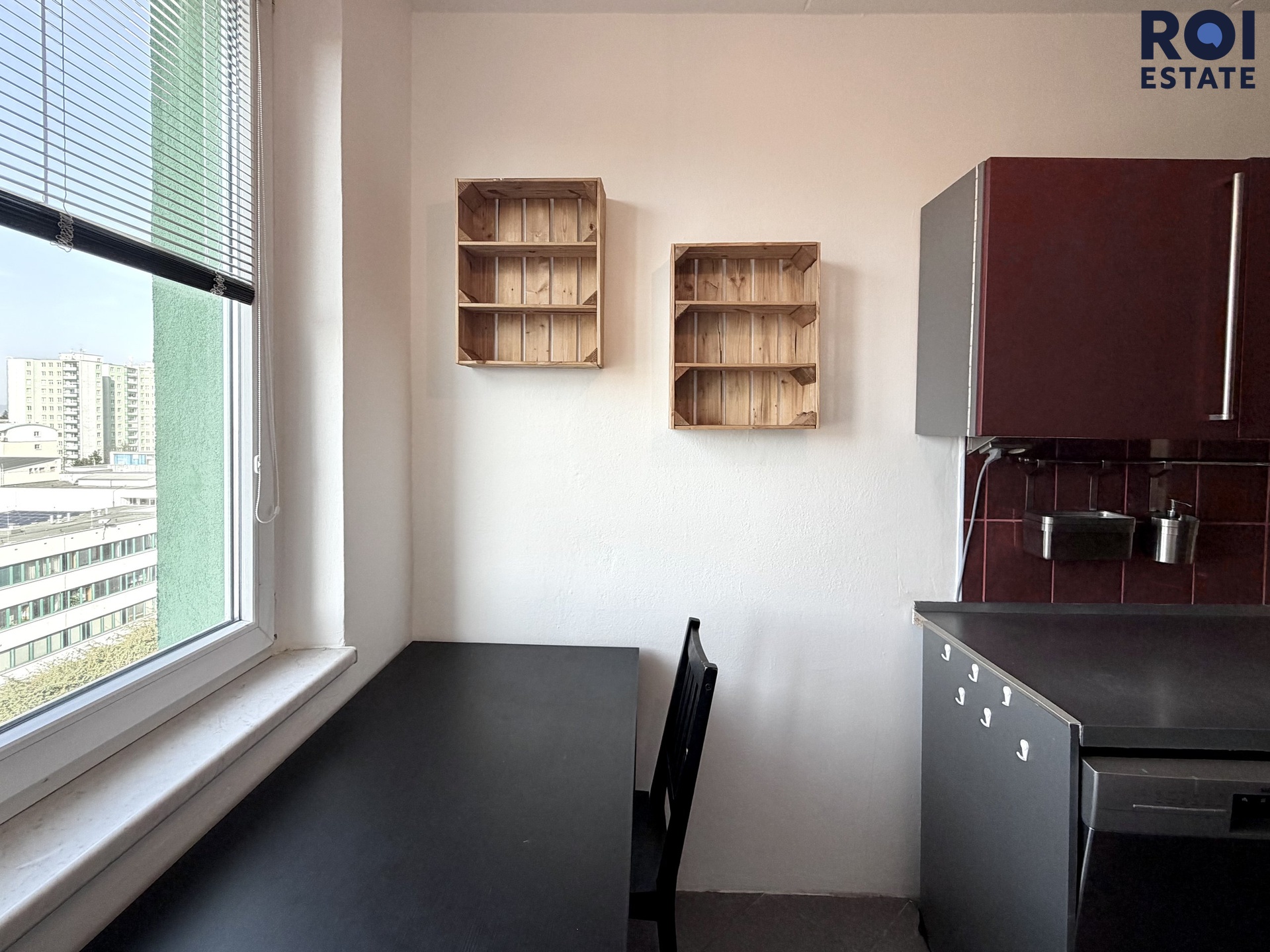 Kuchyň je vybavena indukční varnou deskou, troubou, mikrovlnnou troubou a lednicí. Součástí bytu je také pračka. Další vybavení odpovídá nábytku zachycenému na fotografiích a je součástí podnájmu.