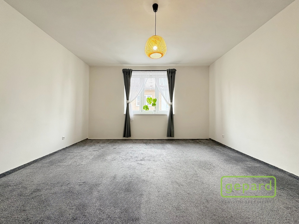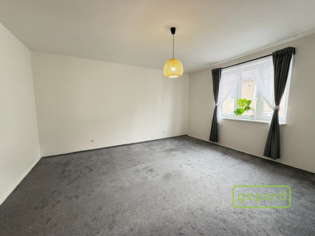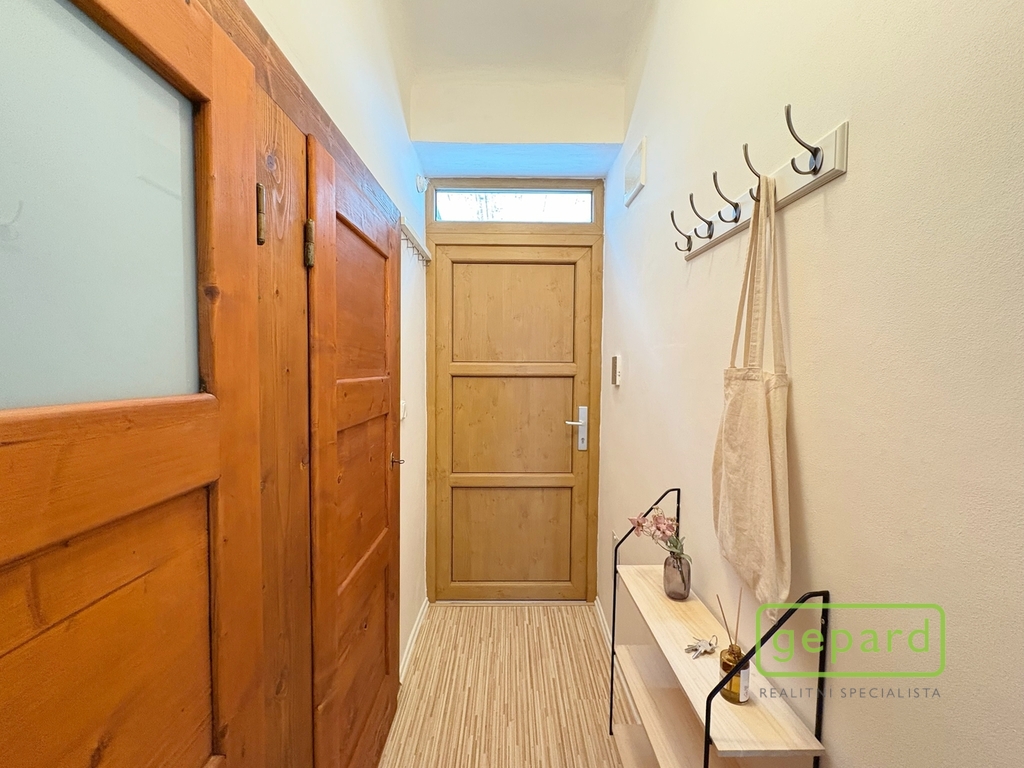 Dispozice bytu zahrnuje vstupní chodbu, samostatné WC, koupelnu s vanou, komoru, prostornou kuchyni, ve které je dostatek místa i pro jídelní kout nebo pracovní místo, a samostatný pokoj o výměře přes 20 m². K bytu náleží nadstandardní sklep o výměře více než 4 m².