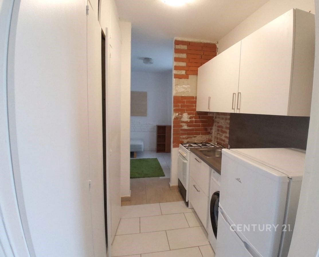 Kuchyně je chytře oddělena a plně vybavena (plynový sporák, dřez, lednice). Velkým bonusem je zcela nová automatická pračka, která je zabudovaná přímo v lince. Také se zde se nachází sestava vysokých vestavěných skříní. Nabízí obrovský úložný prostor, takže v samotném pokoji už nemusíte mít žádné další velké skříně a zůstane vám v něm více místa k žití.