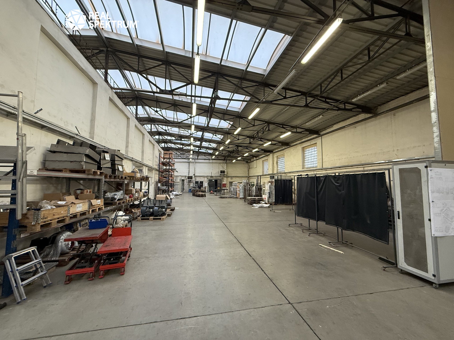 Hala : samostatně přístupná nepodsklepená, dvoulodní, mostové jeřáby, zateplená, tepelné zářiče, 2 x vstup v úrovni podlahy, světlá výška pod nosník 6,2 m. Vrata (4,5 x 6 m). Hala je propojena s prodejnou, skladem, dílenskými prostory, kancelářemi a zázemím pro zaměstnance.