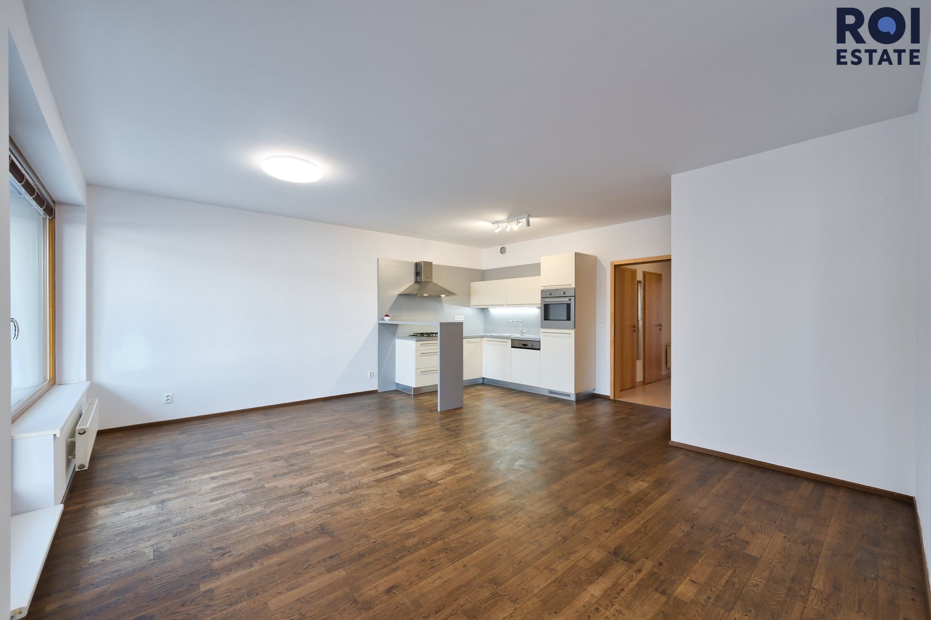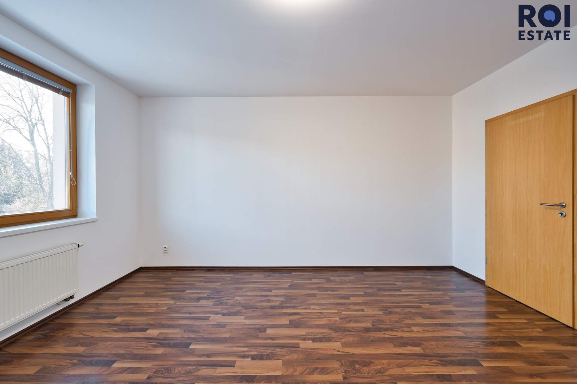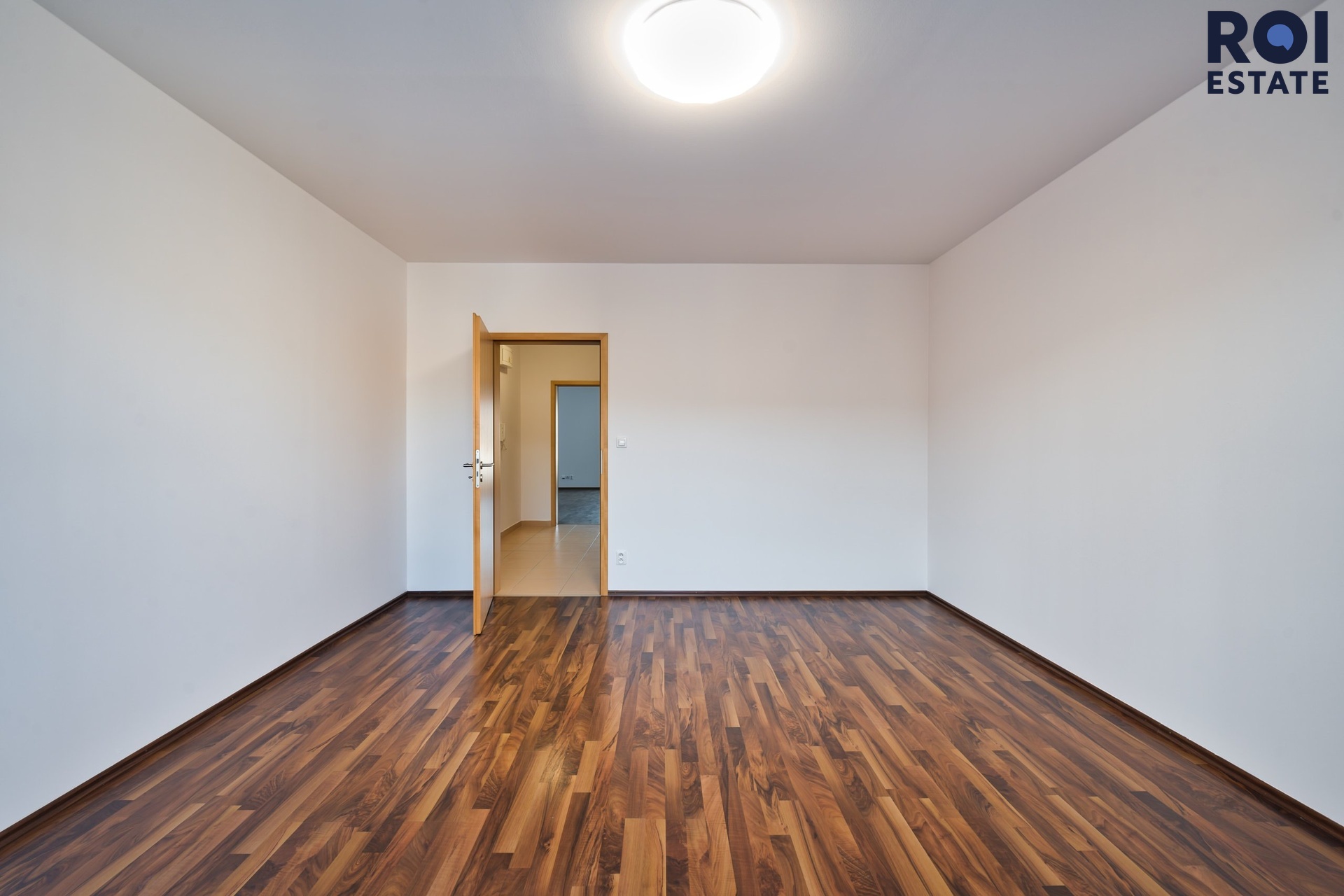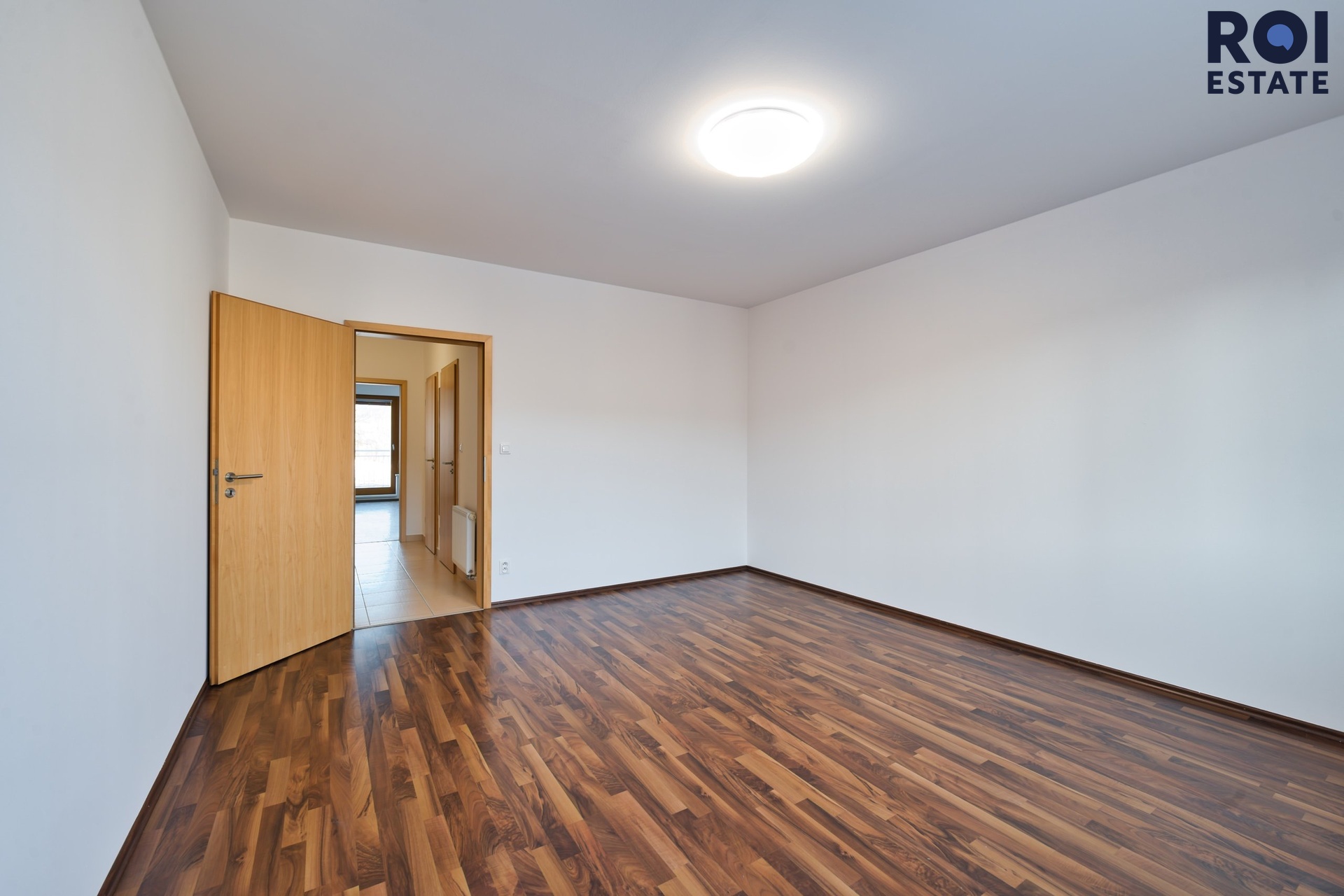 Z chodby se dostanete do ložnice, která působí klidně a odděleně od hlavního obytného prostoru. Díky tomu, že je byt nezařízený, si ji můžete snadno přizpůsobit od minimalistického spaní až po útulnou ložnici s čalouněnou postelí, závěsy a teplým osvětlením.