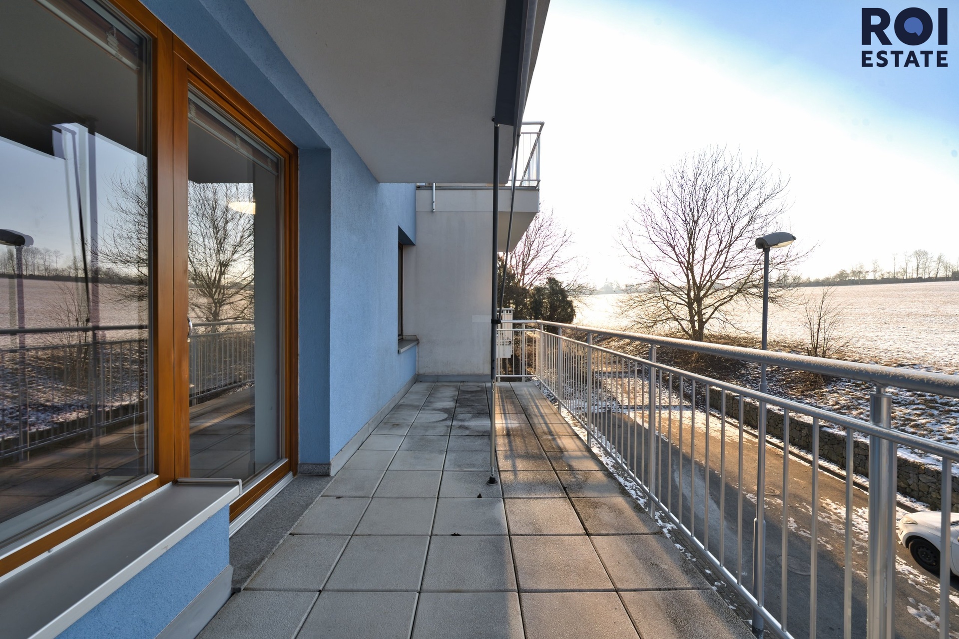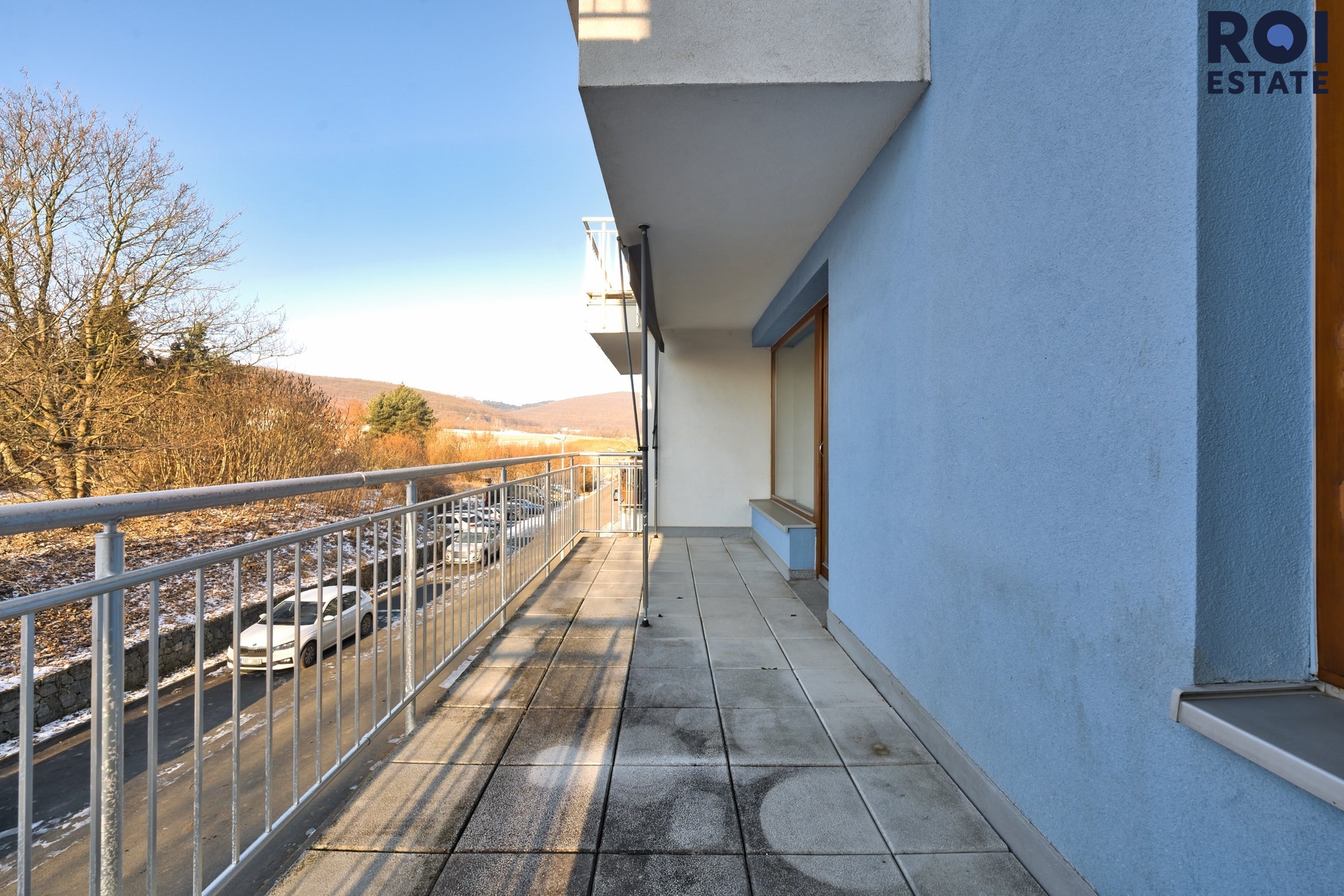 Z obývacího pokoje se vychází na velkou terasu s výhledem do přírody. Terasa je jedním z hlavních benefitů bytu. Nabízí dostatek prostoru na posezení, květiny, bylinky nebo třeba venkovní osvětlení, které z ní udělá příjemné místo i ve večerních hodinách. Je to prostor, který byt přirozeně rozšiřuje a přináší do něj klid a zeleň.
