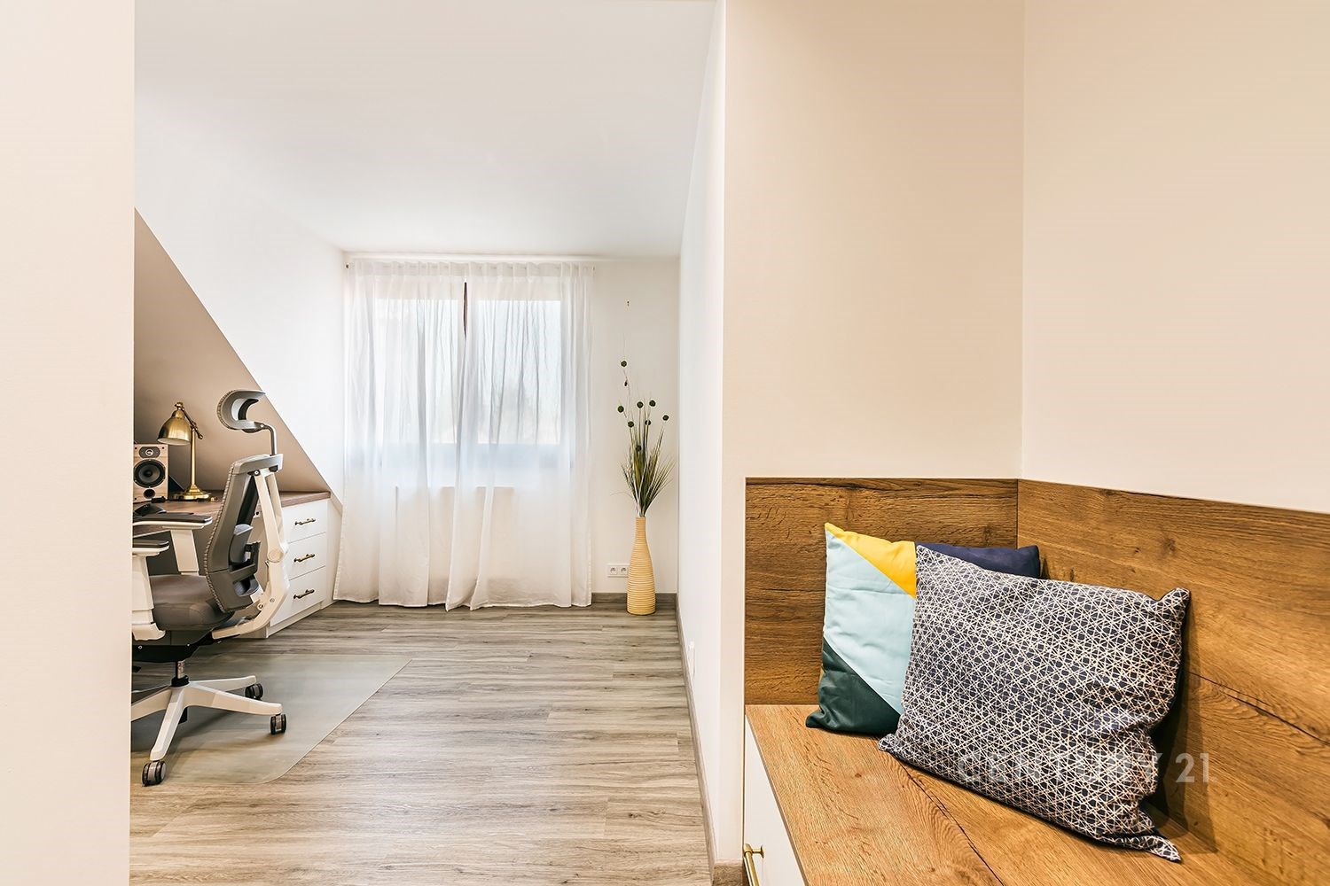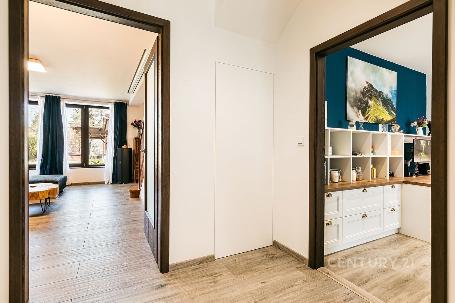 Interiéry byly realizovány pod dohledem bytové designérky, každá místnost působí harmonicky a stylově navazuje na ty ostatní. V přízemí domu je předsíň s vestavěnými skříněmi, pracovna, koupelna se sprchovým koutem, samostatná toaleta, a dále obývací pokoj a kuchyně orientované do zahrady. Na kuchyni navazuje prosklená zimní zahrada sloužící jako jídelna i relaxační zóna. V podkroví naleznete pracovnu, ložnici se šatnou, pokoj pro hosty, velkou koupelnu se zabudovanou saunou a vstup na půdu.