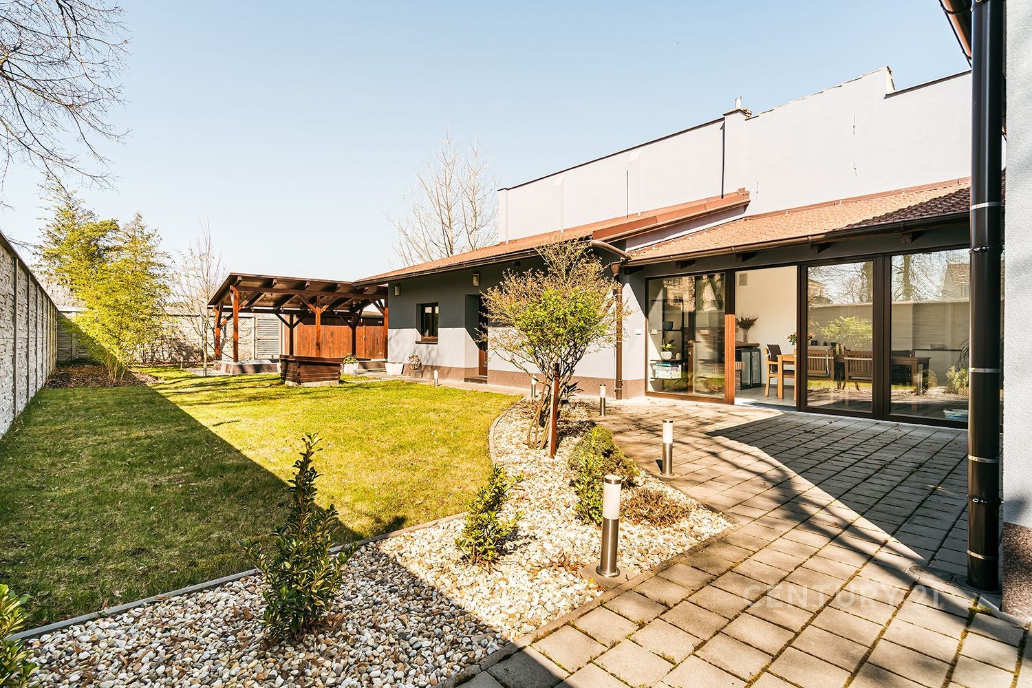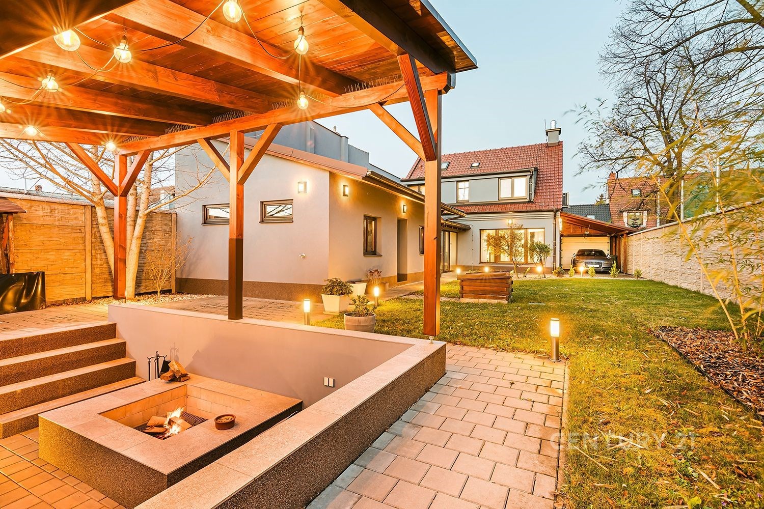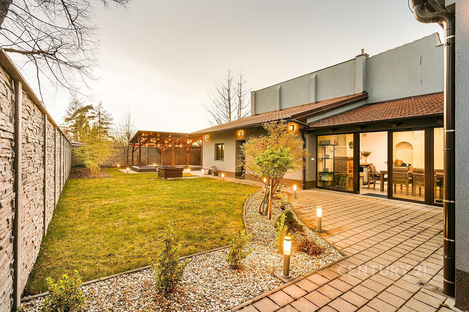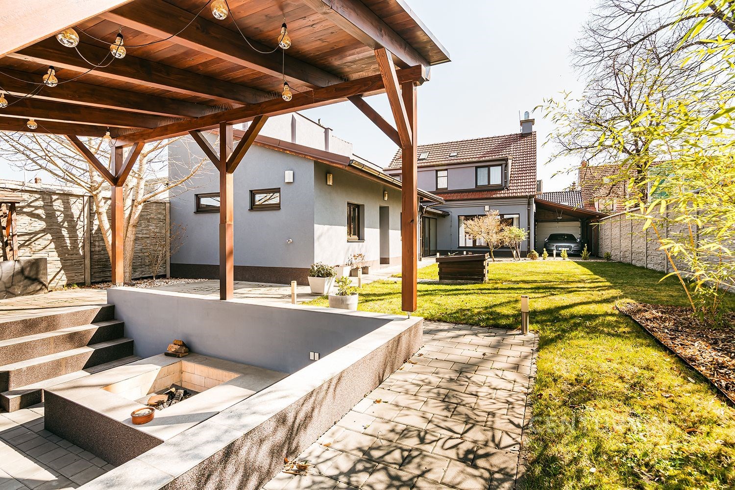 Půdorys stavby vytváří klidnou relaxační zónu a zajišťuje naprosté soukromí. Zahrada je okrasná, najdete zde zapuštěné posezení pod pergolou, trávník s automatickou závlahou, okrasné keře i nenápadný dřevník, kam uložíte vše potřebné např. pro zahradní párty.