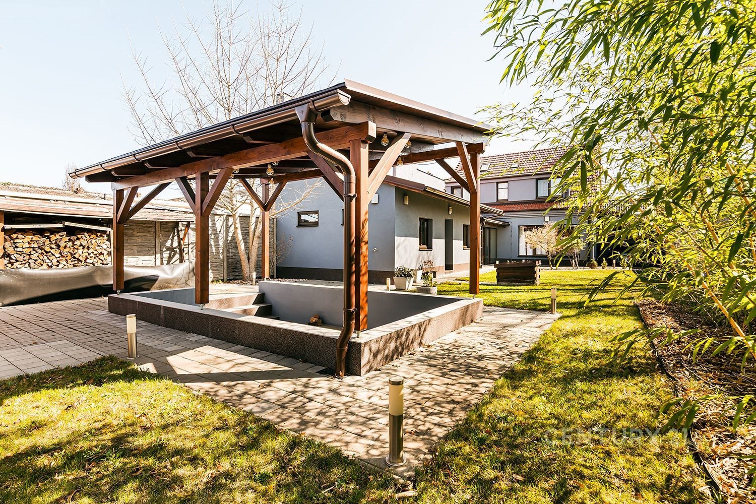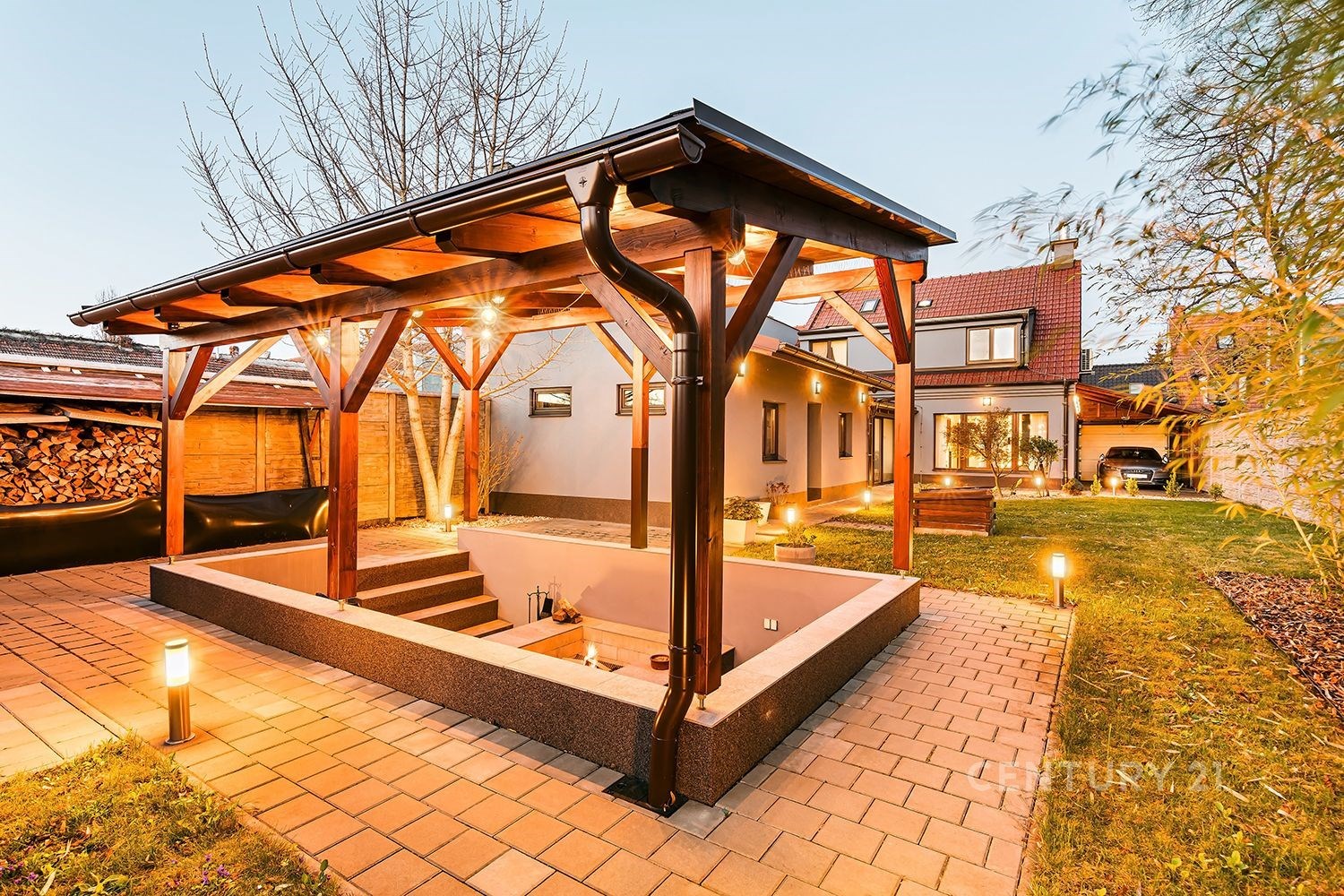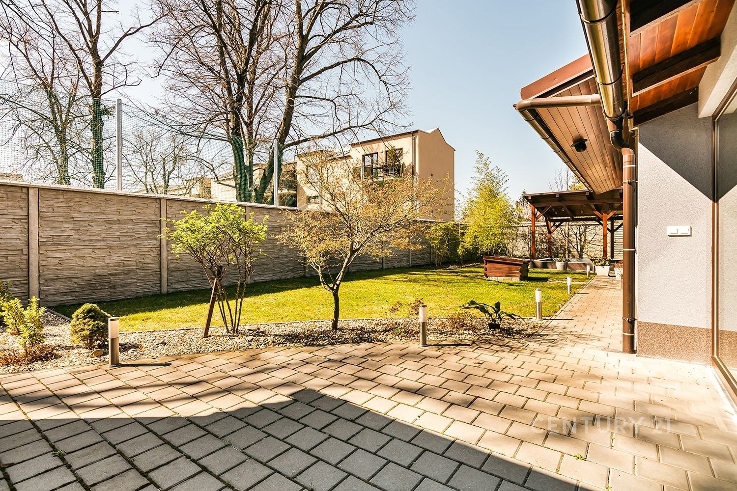 Půdorys stavby vytváří klidnou relaxační zónu a zajišťuje naprosté soukromí. Zahrada je okrasná, najdete zde zapuštěné posezení pod pergolou, trávník s automatickou závlahou, okrasné keře i nenápadný dřevník, kam uložíte vše potřebné např. pro zahradní párty.