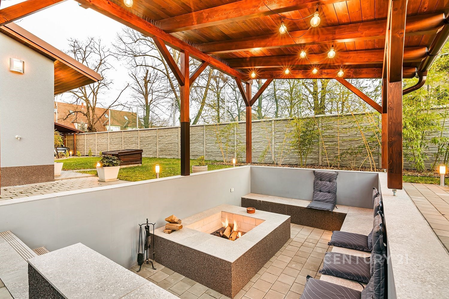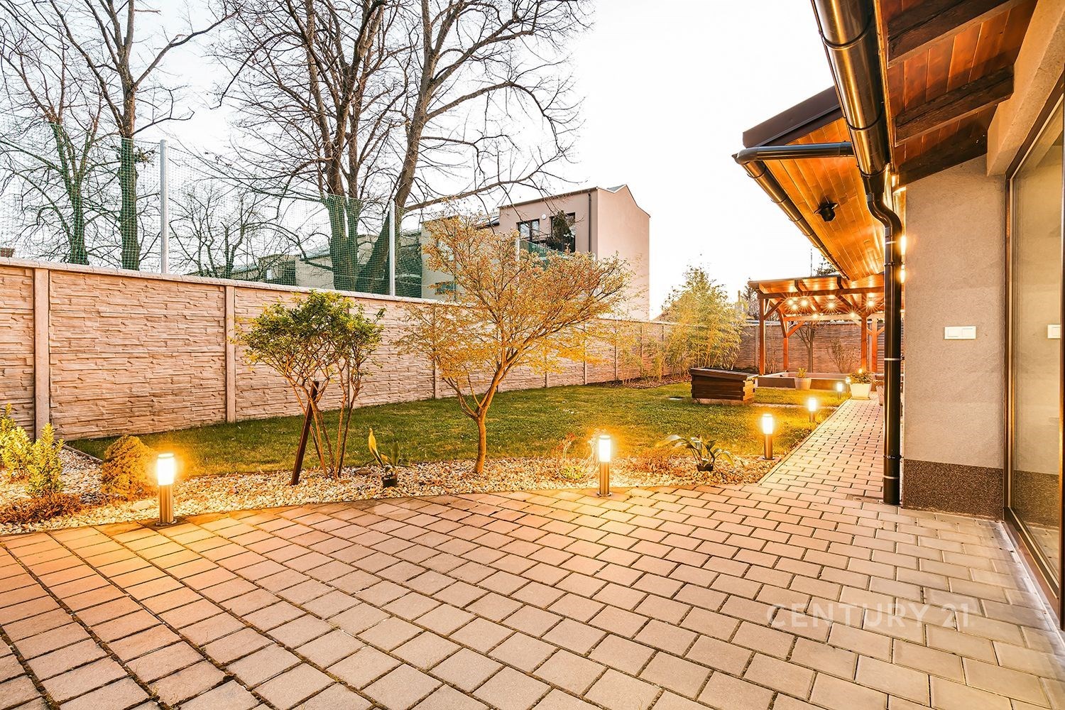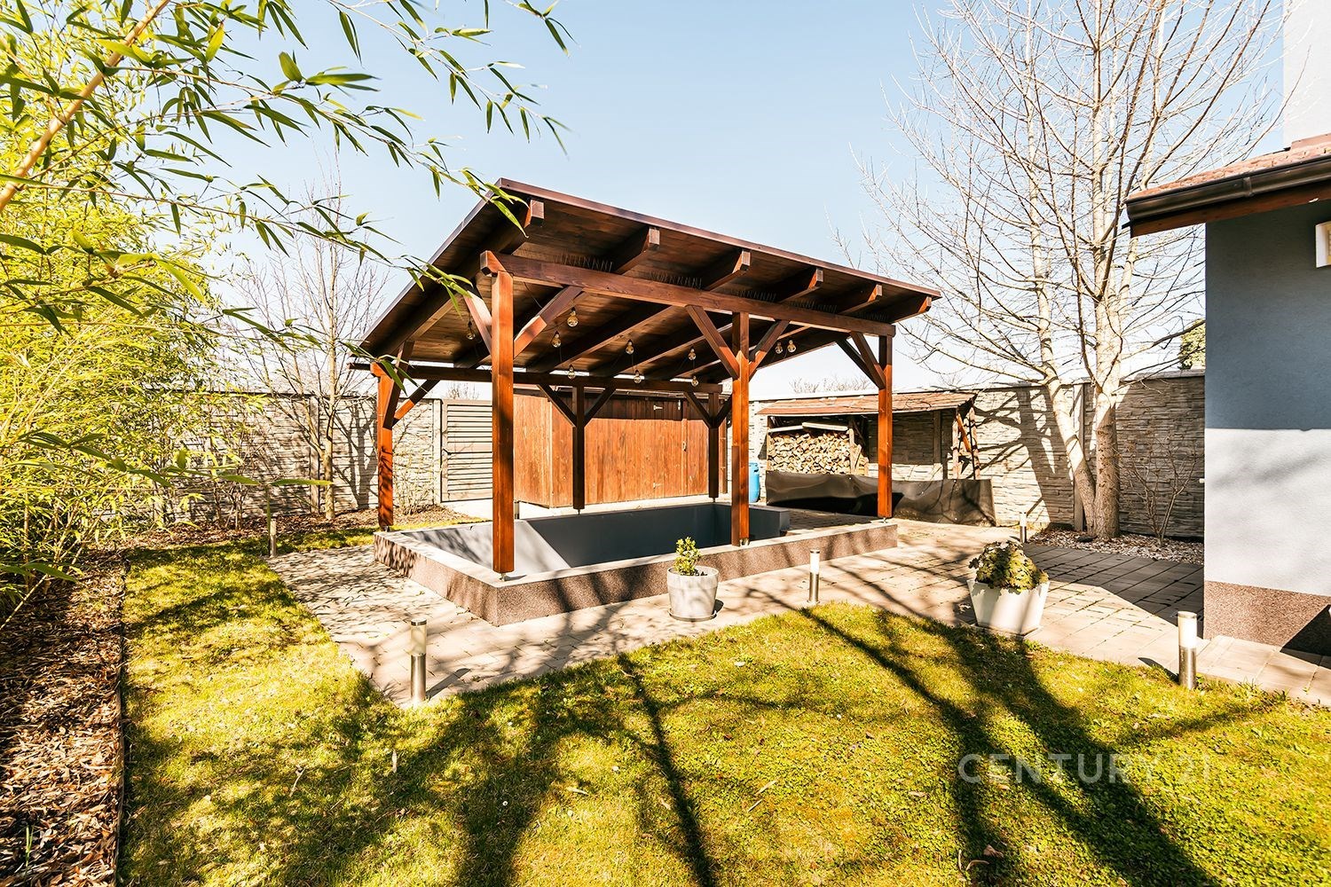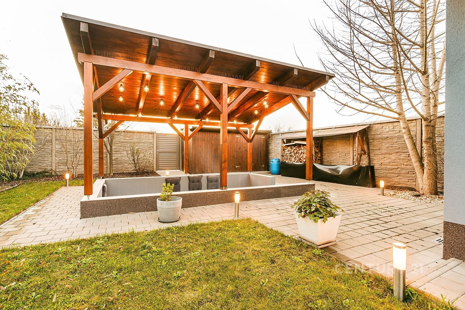 Půdorys stavby vytváří klidnou relaxační zónu a zajišťuje naprosté soukromí. Zahrada je okrasná, najdete zde zapuštěné posezení pod pergolou, trávník s automatickou závlahou, okrasné keře i nenápadný dřevník, kam uložíte vše potřebné např. pro zahradní párty.