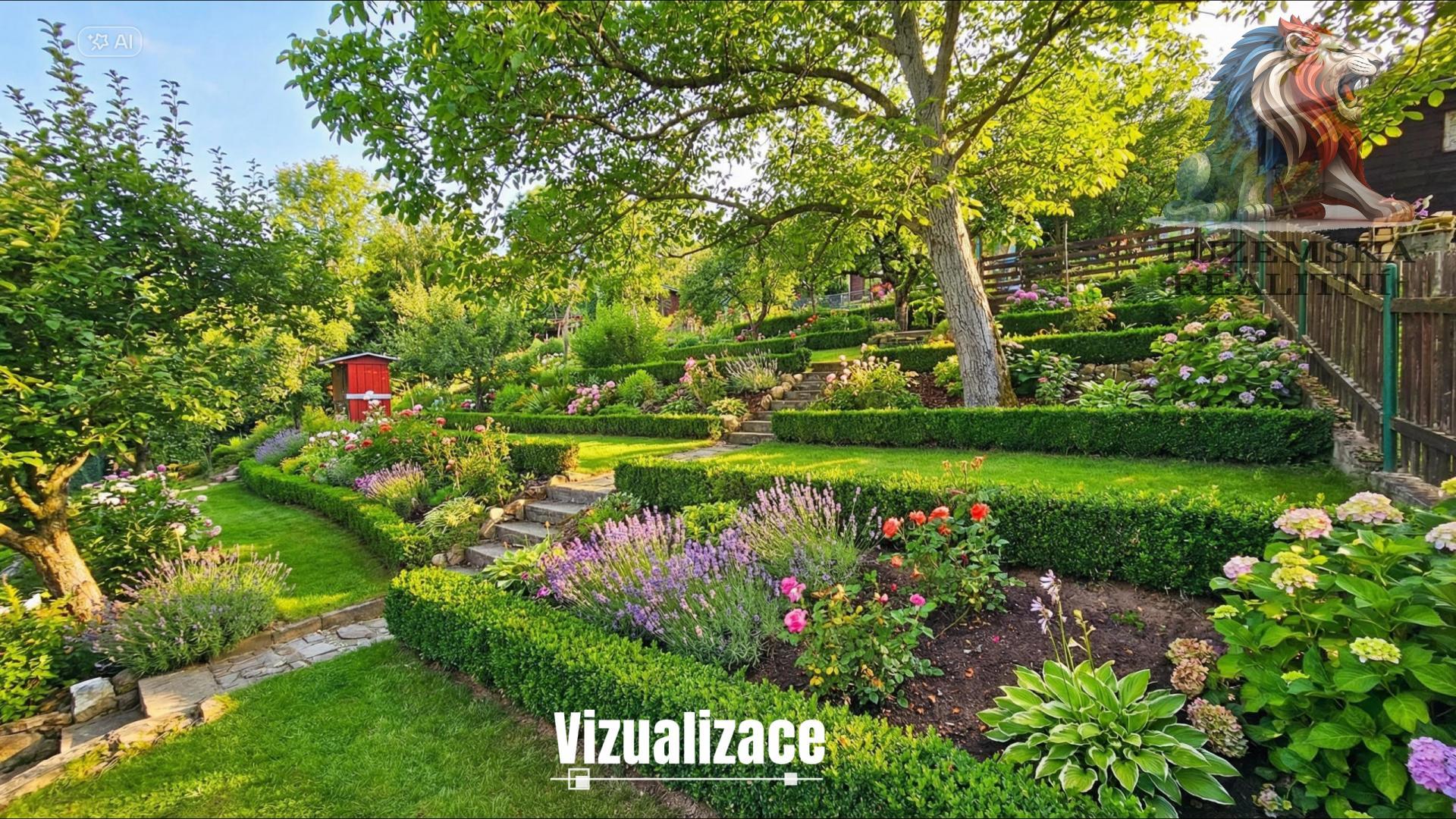 Zahrada je orientovaná na jih, krásně na ni svítí sluníčko. Rostou na ní jabloně a vlašské ořechy. Je svažitá a jsou na ni vytvořeny kaskády jako vodorovné plochy. Je obdélníkového tvaru o stranách cca 15m x 27,5m.