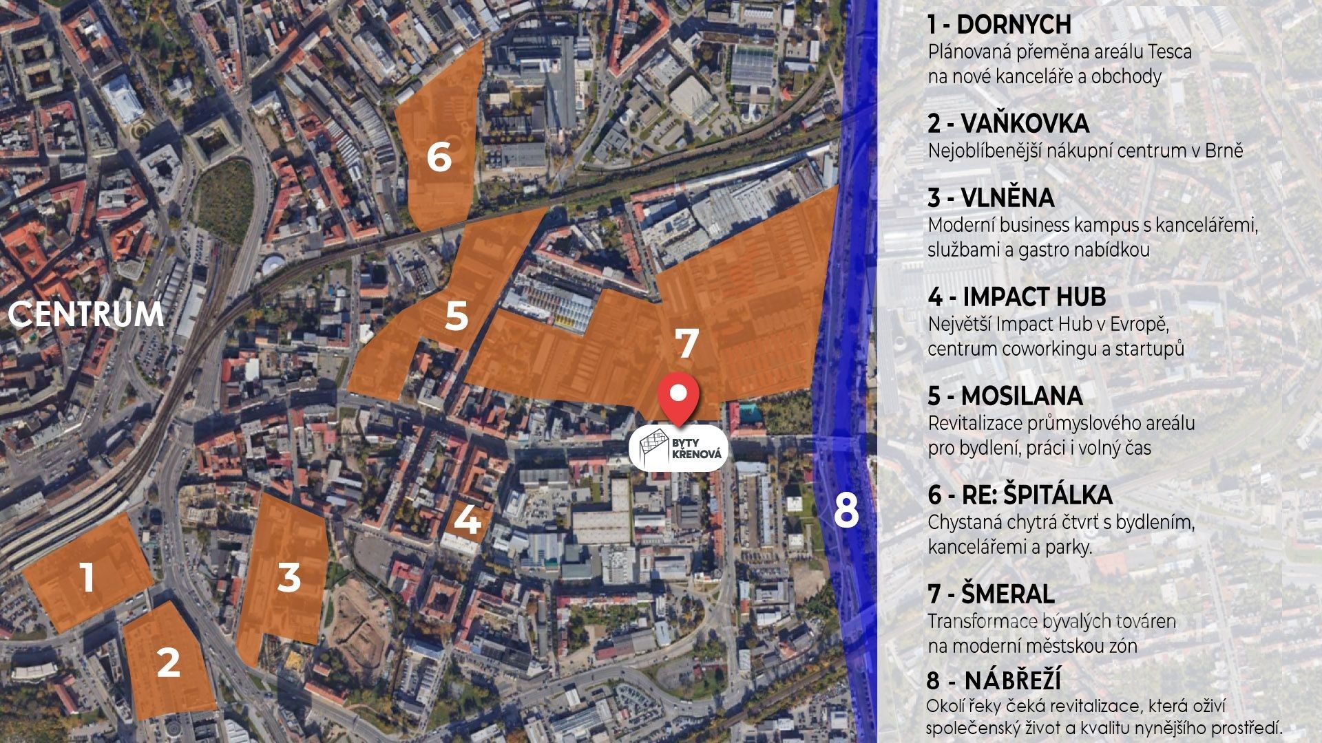 Bydlení v centru Brna už dávno neznamená jen hluk a shon. Jen pár kroků od prahu najdete stylové kavárny, restaurace a v blízkosti nedaleké řeky Svitavy brzy vznikne atraktivní náplavka s pásy zeleně ideální místo pro aktivní trávení volného času.