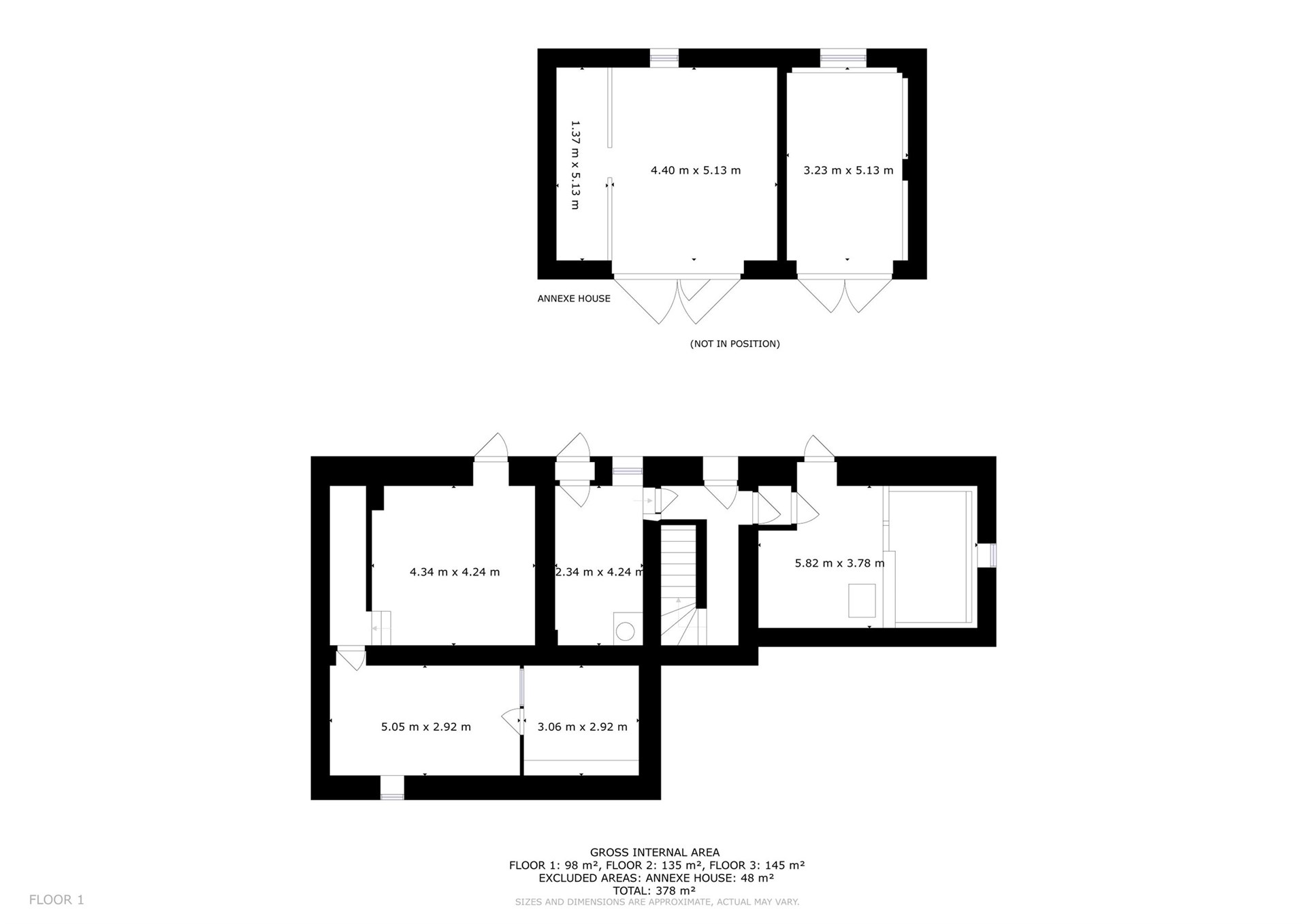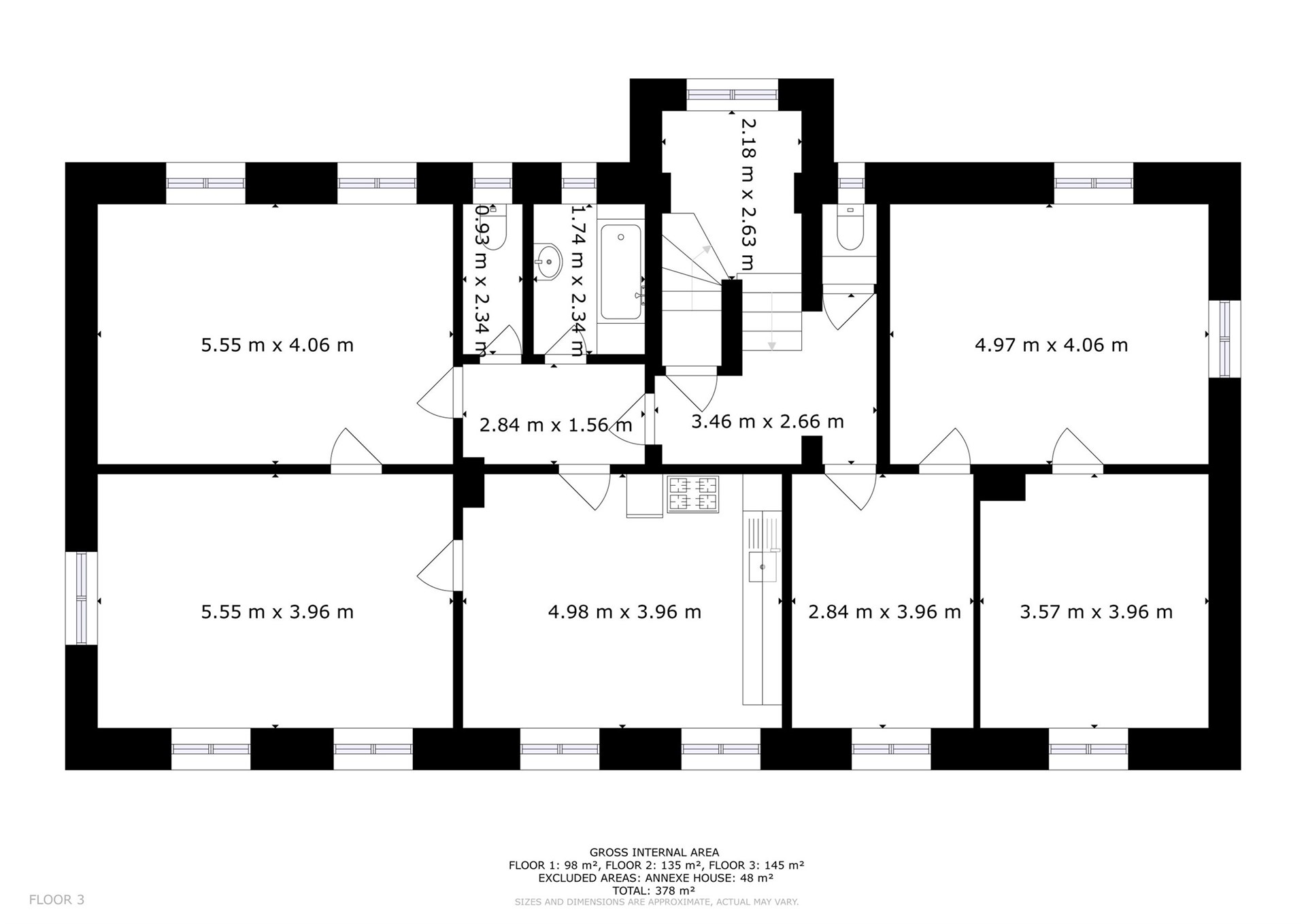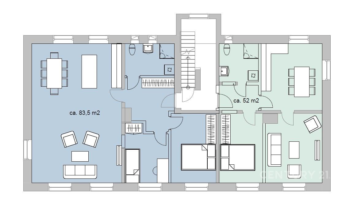 3) 2.NP. je řešeno jako bytová jednotka o dispozici 5+1 s celkovou podlahovou plochou 145m2. Zde je velký potenciál opět přebudovat na 2 bytové jednotky, kdy by mohla vzniknout dispozice 3+kk (3+1) o cca 83m2 a druhá jednotka o dispozici 2+1 s přibližně 52m2.