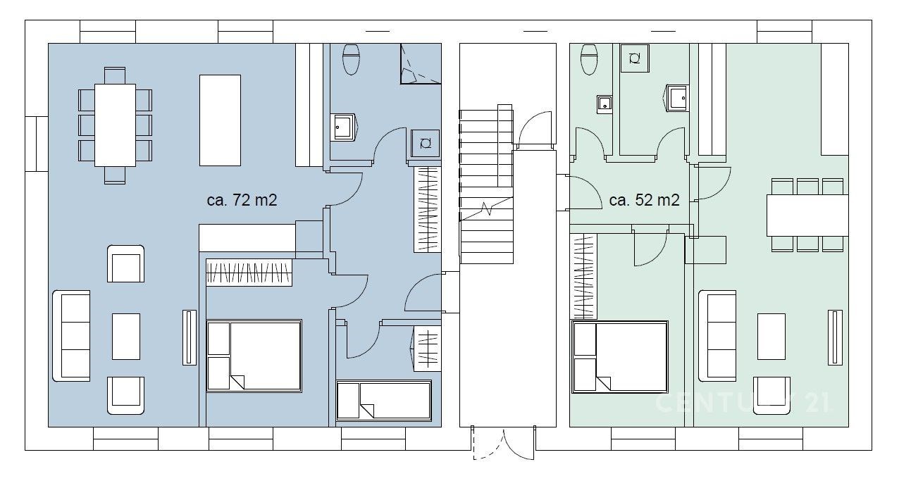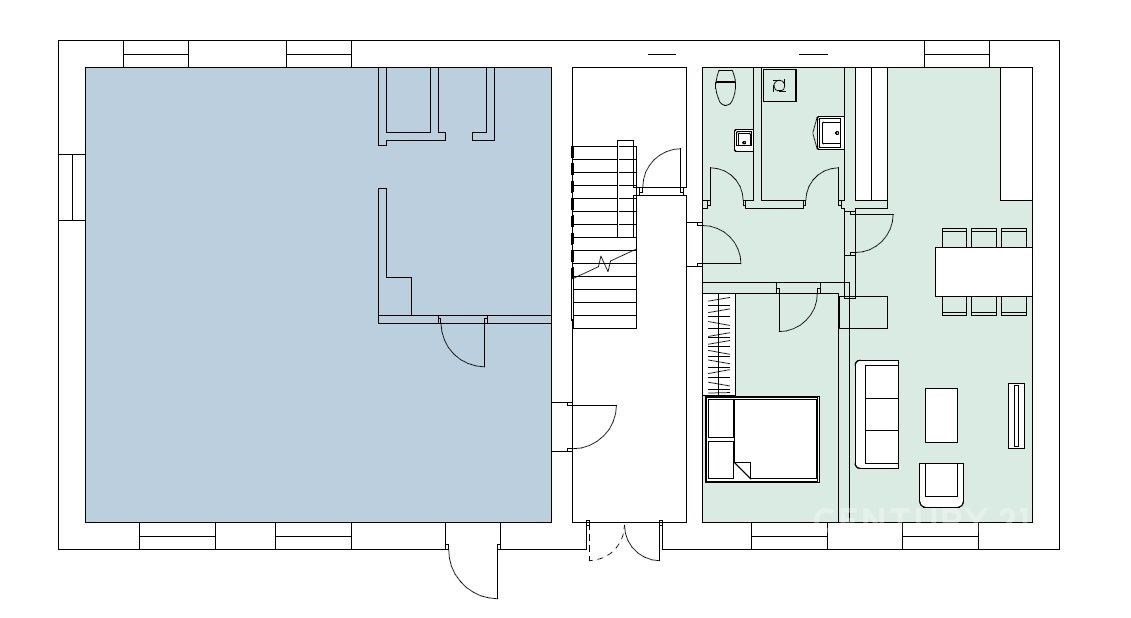 2) 1. NP. resp. přízemí je rozděleno vstupní chodbou a centrálním schodištěm na dvě části. Při vstupu do domu levá část je aktuálně řešena jako obchodní prostora, například zřízení prodejny, provozování služeb či kanceláře, celkový prostor má rozlohu okolo 70m2. Pravá strana je bytová jednotka, aktuálně o dispozici 2+kk, s možností zachování dispozice, případně snadného přebudování na dispozici 2+1. Podlahová plocha činí okolo 52m2.