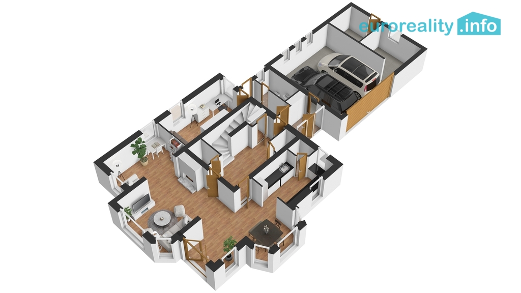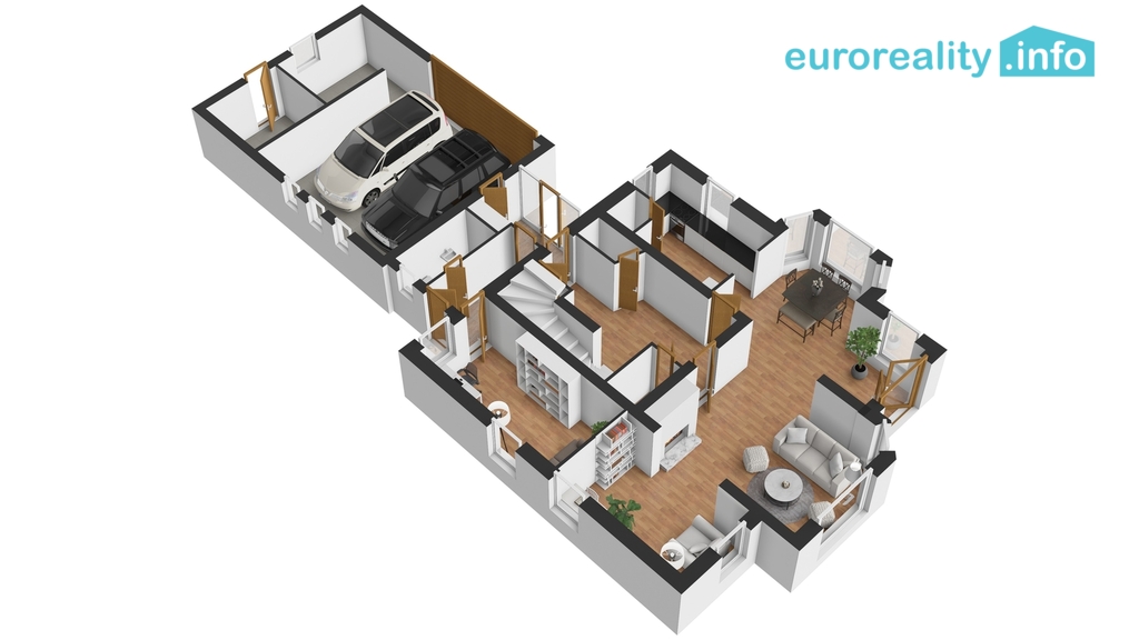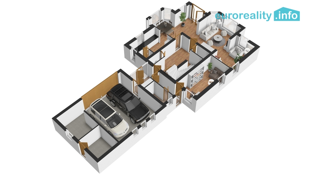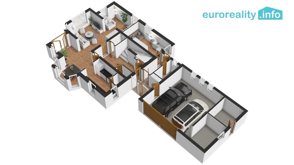 V přízemí je projektován velkorysý obývací pokoj s jídelnou a kuchyní, halou, pracovnou a velkou garáží se sklady. V podkroví 4 ložnice, koupelny, půda a v suterénu 3 sklepy.
