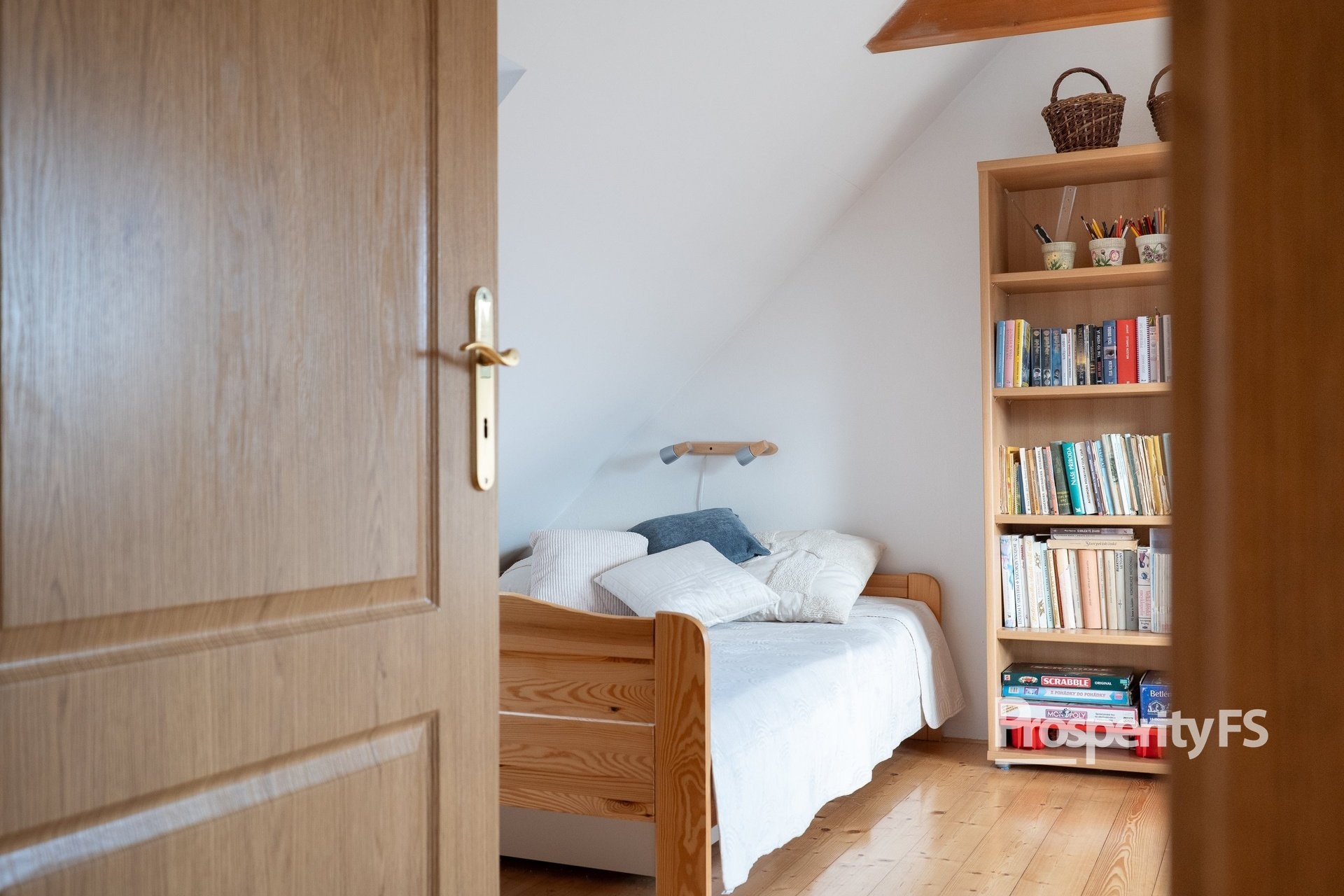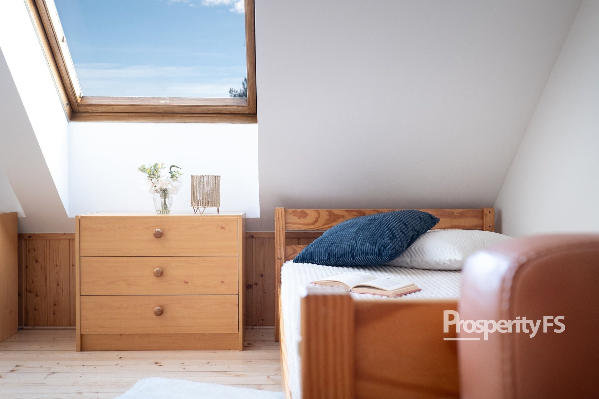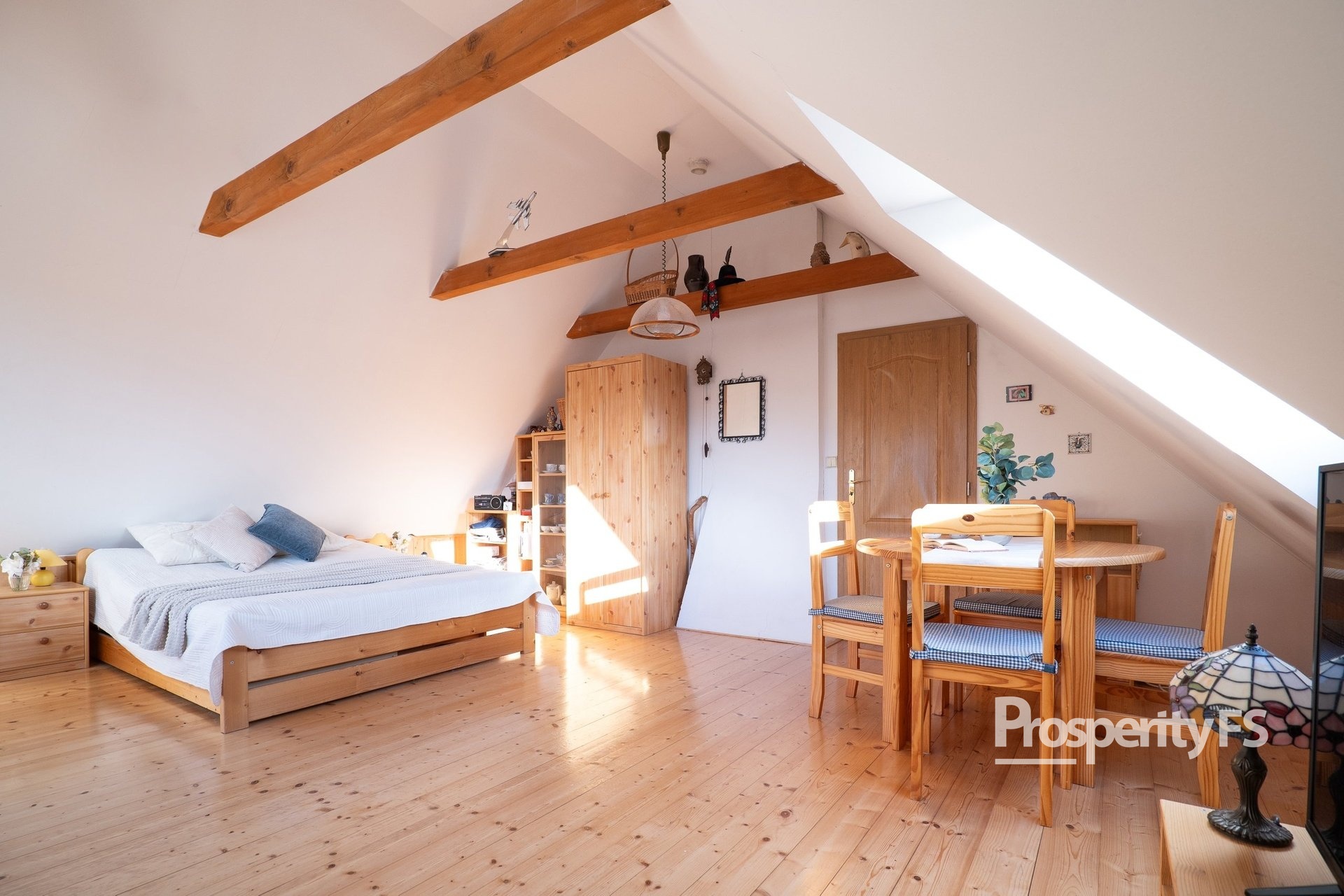 • Byt v 2.NP je zařízen taktéž jako plně samostatná bytová jednotka, tentokrát ve stylu z přelomu roku 2000 s důrazem na použití dřeva