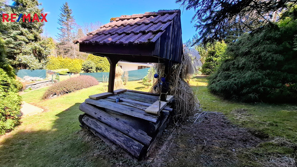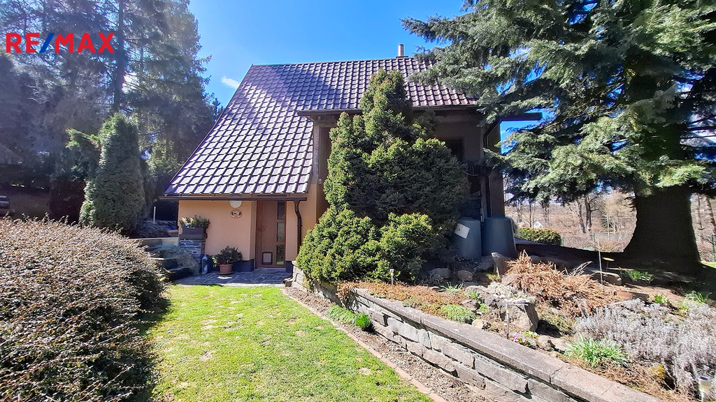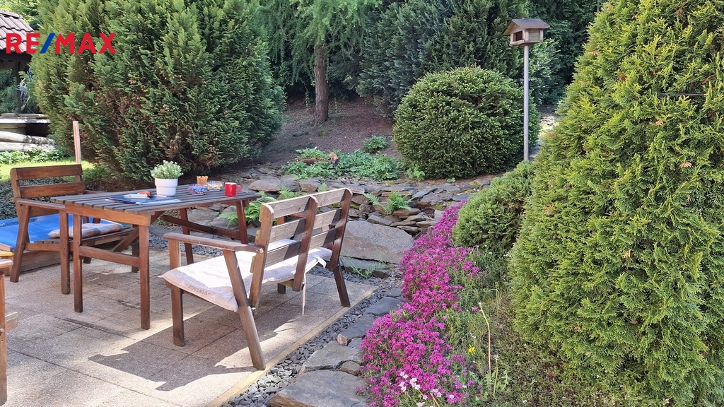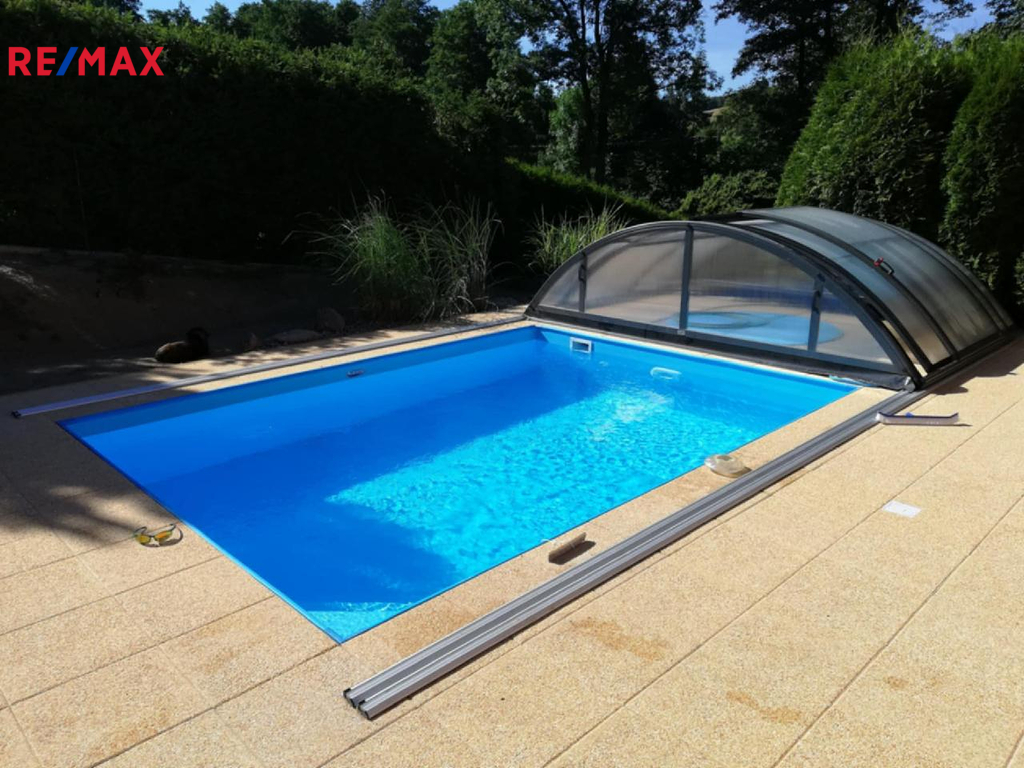 Dům se nachází uprostřed oplocené okrasné zahrady se slunnou terasou a zapuštěným bazénem ALBIXON se zastřešením a protiproudem. Pod zahradou se nachází vstup do sklípku, který lze využít jako vinný sklípek. Ve spodní části pozemku je postavena kůlna na nářadí, dílna, tři krytá garážová stání, betonový gril, skleník a kuželky.