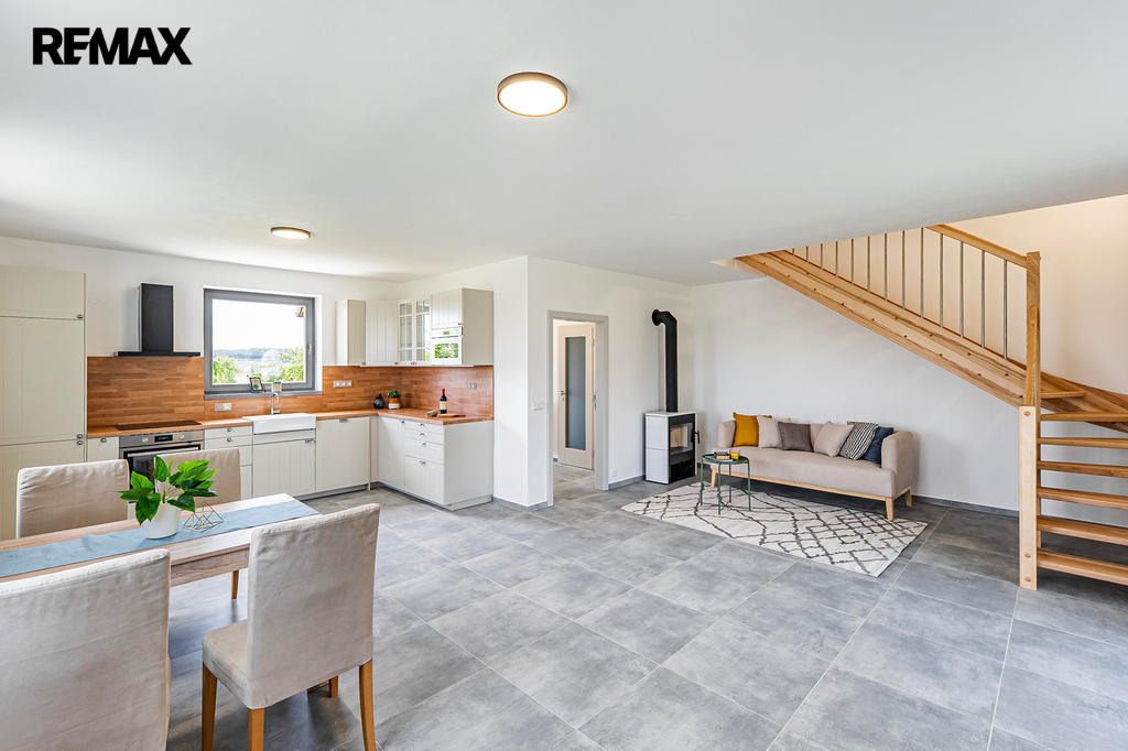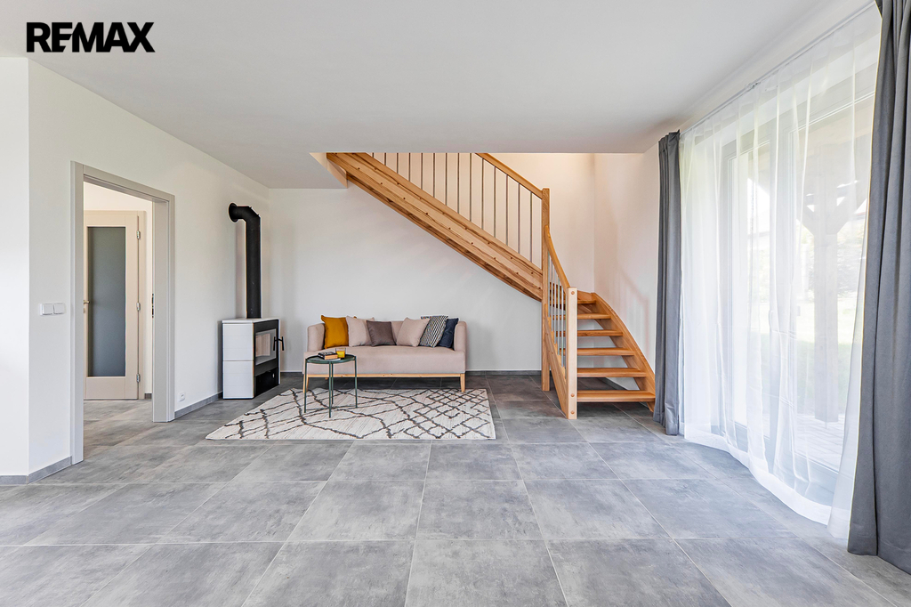Jedná se o dvoupodlažní dům s užitnou plochou 120 m2, který nabízí dispozici 4+kk a poskytne vám dostatek prostoru pro pohodlné rodinné bydlení. Najdete zde moderní kuchyňskou linku včetně spotřebičů, kdy tento prostor přechází v útulnou obývací část s kachlovými kamny, které vám v zimních měsících dodají potřebné teplo a skvělou atmosféru. Koupelna je vybavena vanou a příslušenstvím a v domě máte k dispozici dvě toalety. V interiéru se nachází dřevěné schody a dveře, plovoucí podlahy a kvalitní keramická dlažba.
