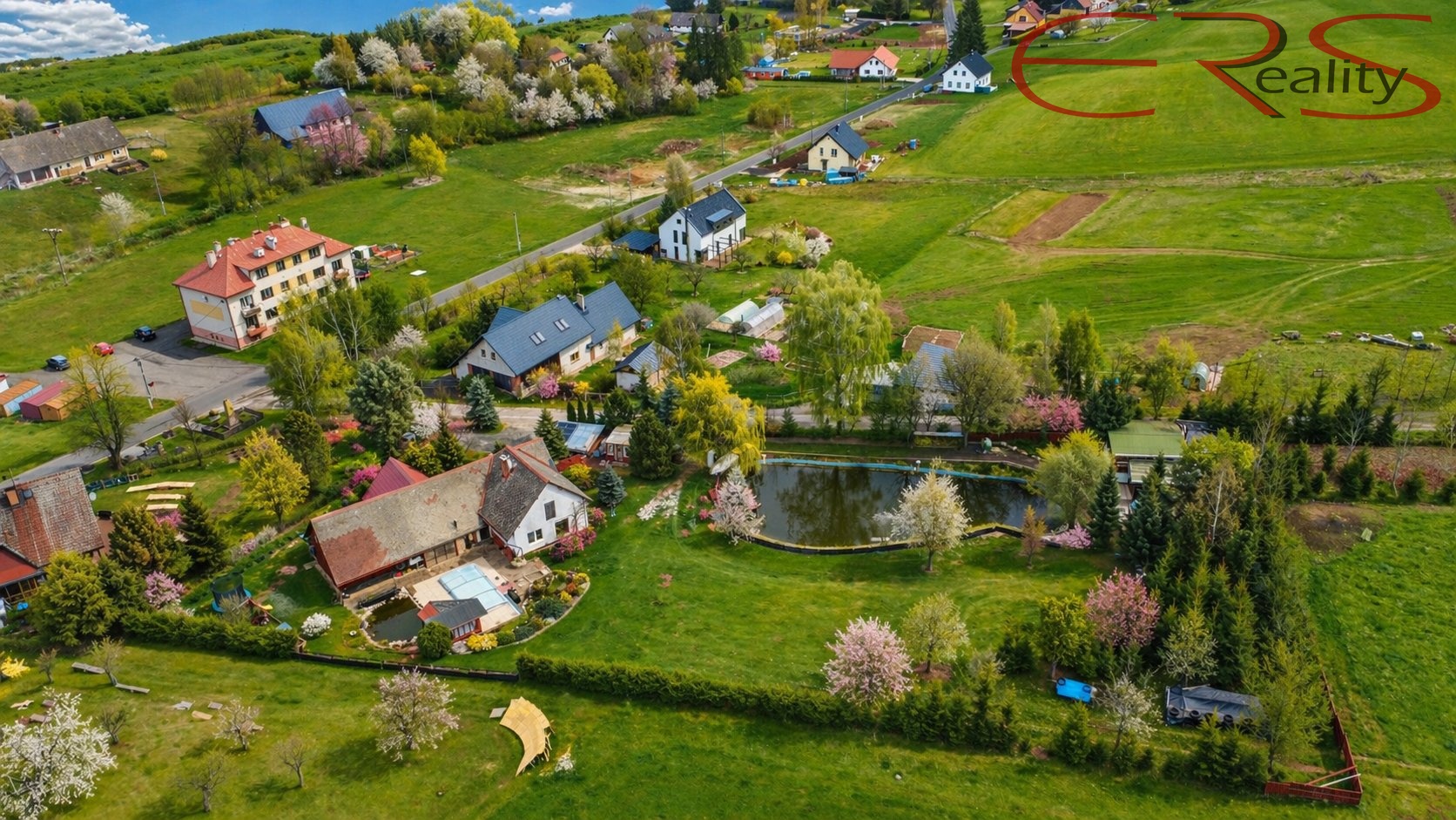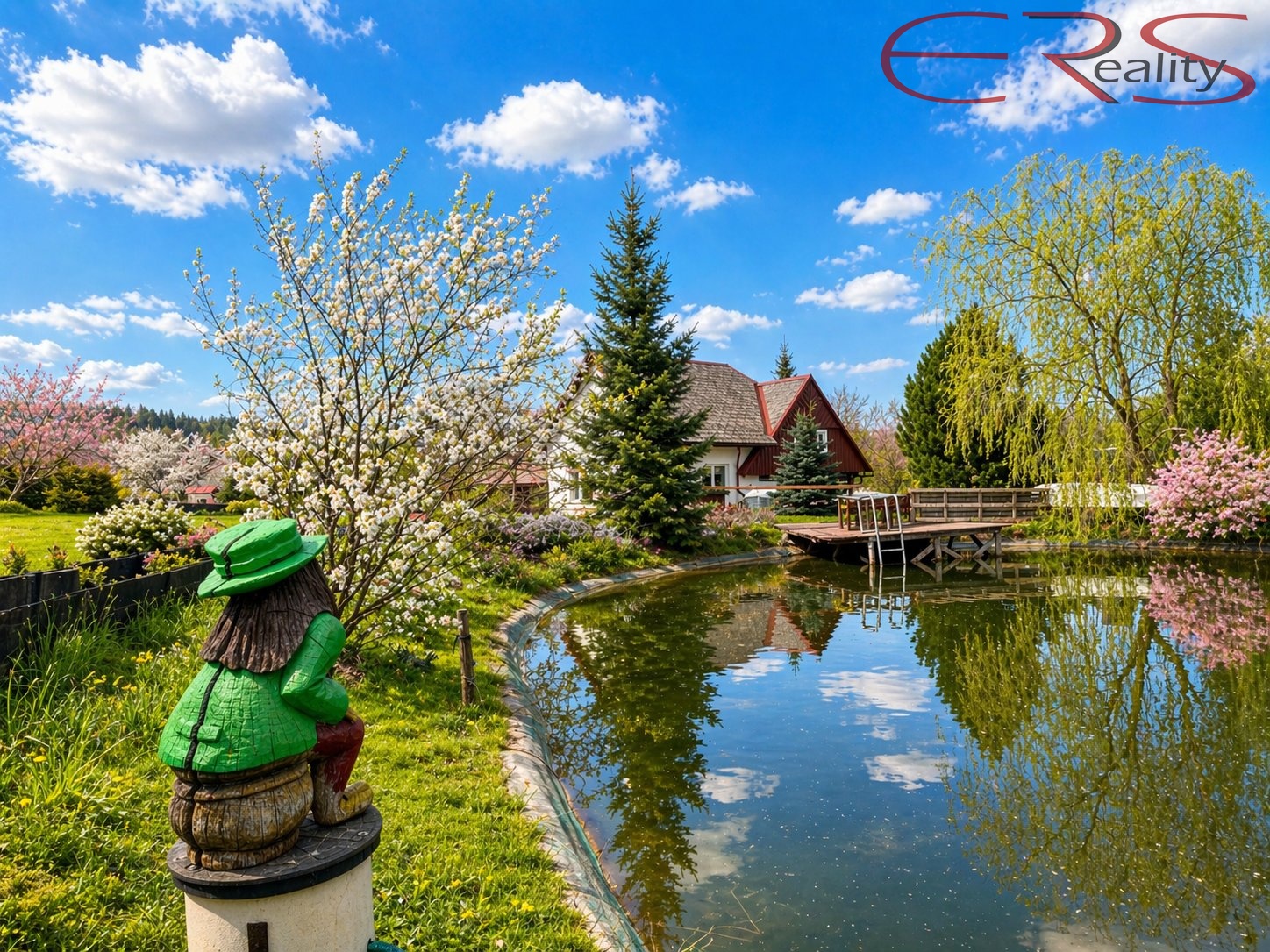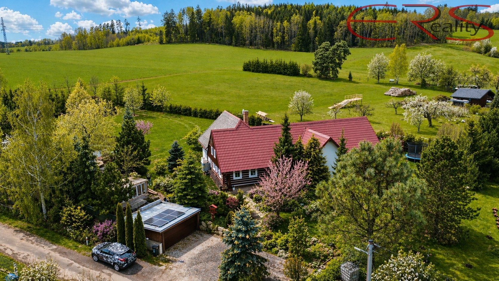 A teď to hlavní, co z téhle nabídky dělá spíš malý soukromý svět než obyčejný dům. Pozemek o výměře 3.938 m² je oplocený a nabízí prostor, který dnes většina lidí zná už jen z vyprávění nebo z pohádek, kde za chalupou bývá louka, voda a klid. K dispozici je vedlejší stavba, kryté stání pro dva automobily, bazén 6 × 3 m se slanou vodou, dětské hřiště, trampolína a také rybníček s divokými kachnami. Ano, opravdu. Některé domy mají maximálně túje a plastového čápa. Tady máte vlastní vodní scénu.