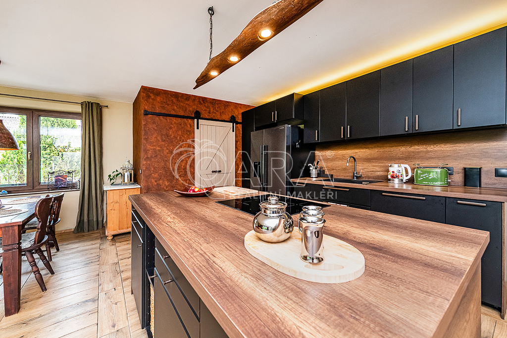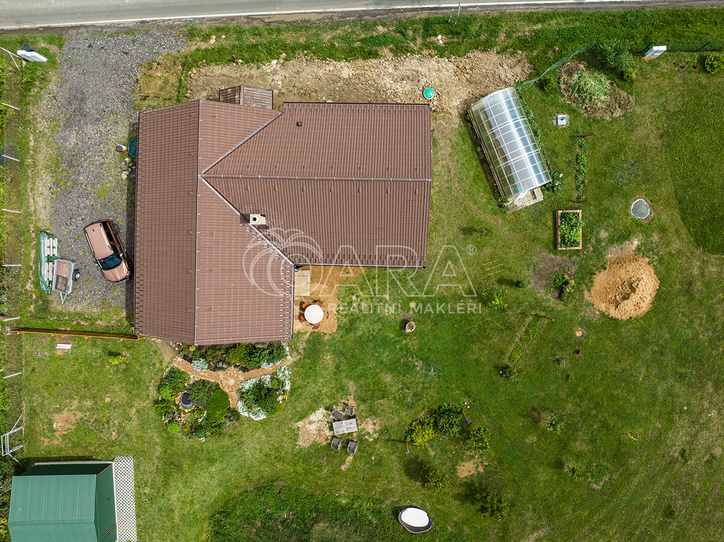 Dům z roku 2021 a má jedno podlaží do písmene L, kde najdete předsíň, technickou místnost, WC s bidetem, prostorný obývací pokoj, moderní kuchyni s ostrůvkem a spíží, koupelnu s vanou a sprchovým koutem, a tři samostatné pokoje.