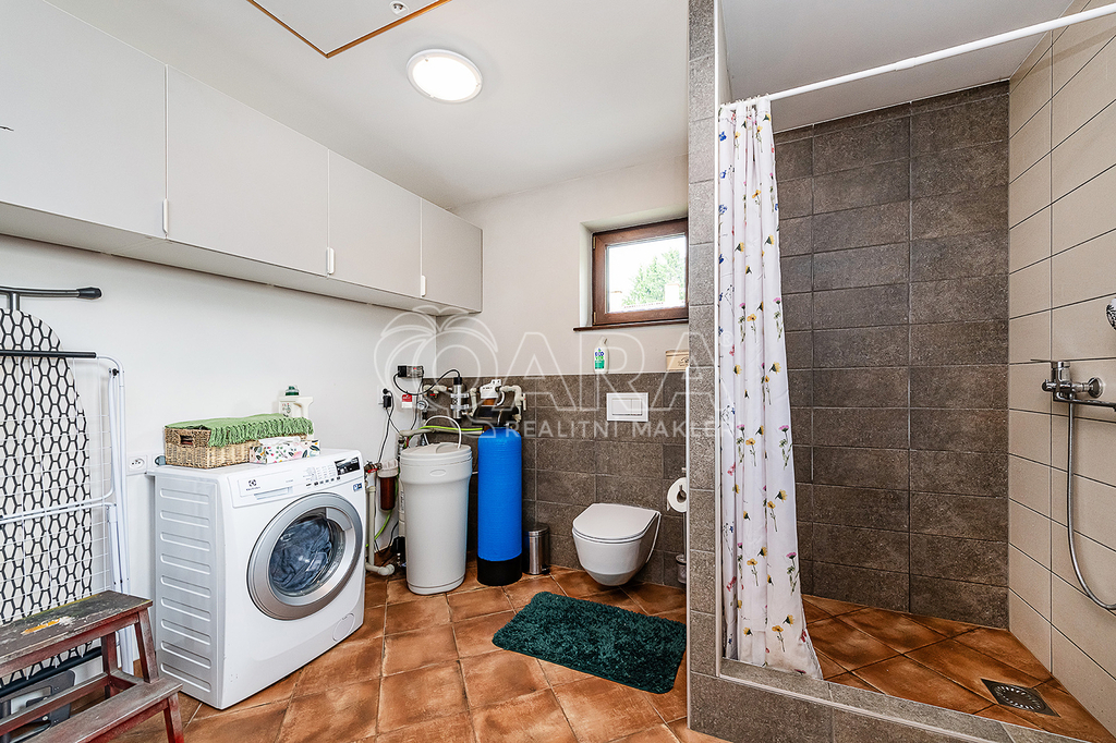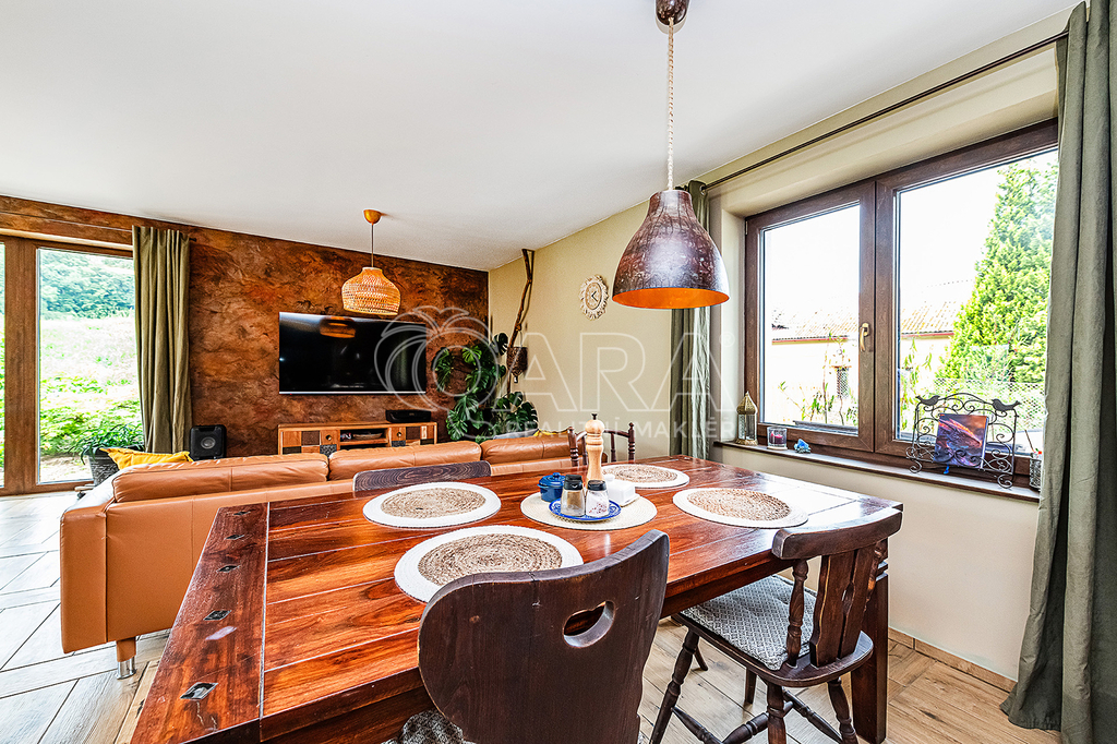 Vytápění a ohřev teplé vody je řešen tepelným čerpadlem vzduch - voda s celkovým ročním nákladem za energie 43 tis. Kč, tj. 3.600,- Kč měsíčně (doloženo vyúčtováním). Topení je v celém domě podlahové. Topit lze i v sálavém krbu a vytopit celý dům. Zdivo porotherm 44 cm, zateplené navíc oproti projektu 4 cm polystyrénem (PENEB bez tohoto dodatečného zateplení), trojtá plastová okna se zesíleným rámem. Kuchyňská linka je plně vybavena, elektrická varná deska, el. trouba, myčka a volně stojící americká lednice. Vlastní vrtaná studna, veřejný vodovod ve výstavbě. Domácí čistička odpadních vod napojena na dešťovou kanalizaci, jímka na dešťovou vodu, dvě plechové garáže (25+ 12m2). Parkování vedle domu pro čtyři auta, oplocení, velký skleník, zabezpečovací zařízení.