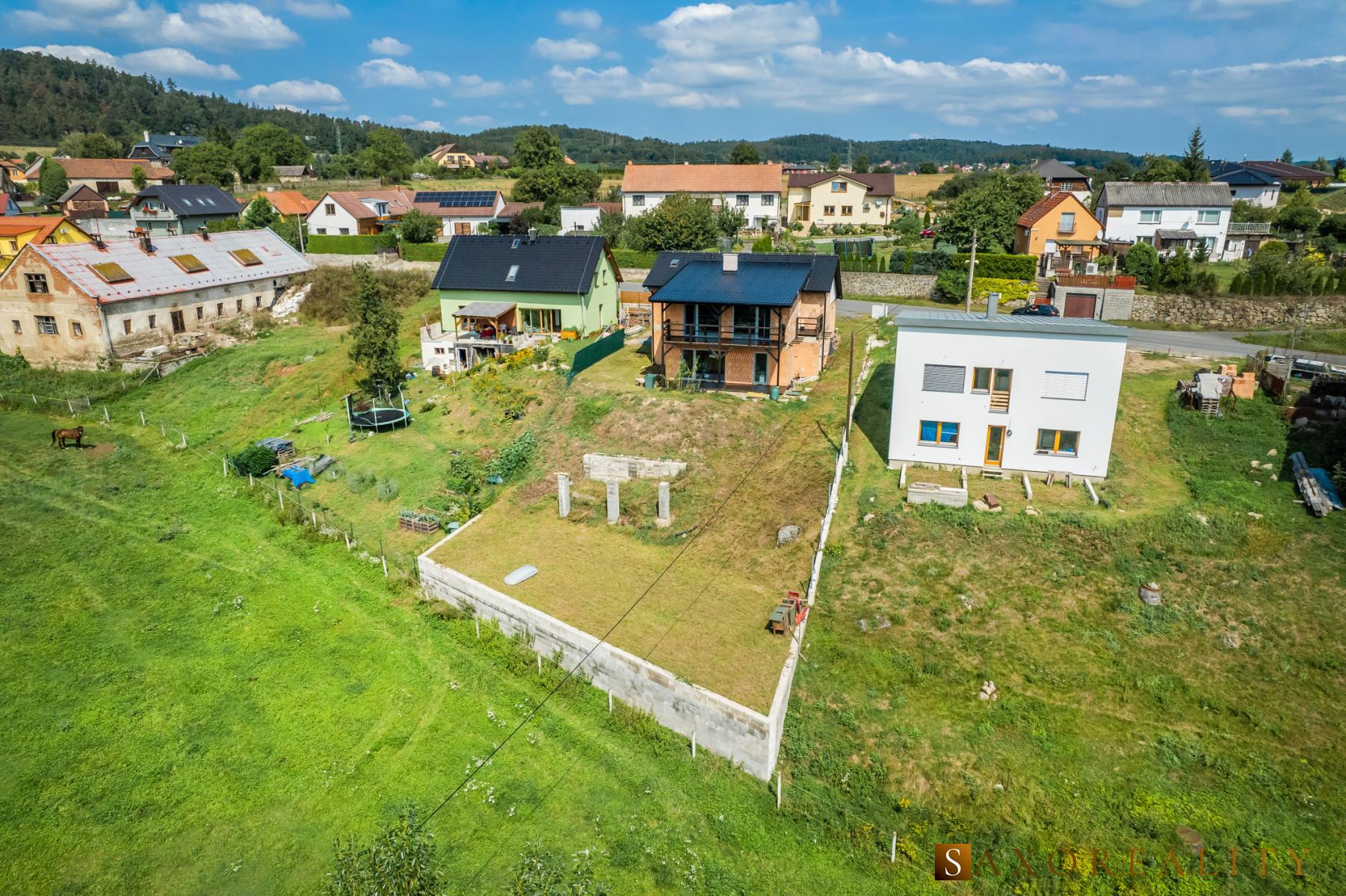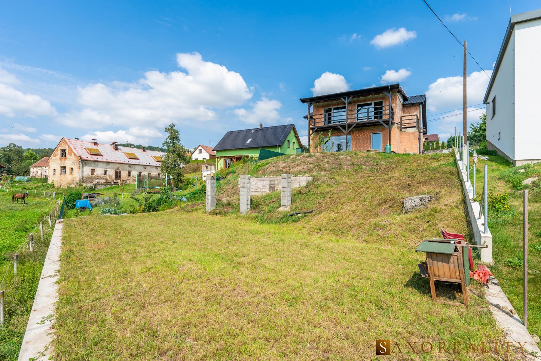 Pozemek o výměře 901m2 je mírně svažitý, takže ze všech míst budete mít krásný výhled a ve spodní části se provedli terénní úpravy včetně zpevnění betonovou podezdívkou jako příprava pro bazén.